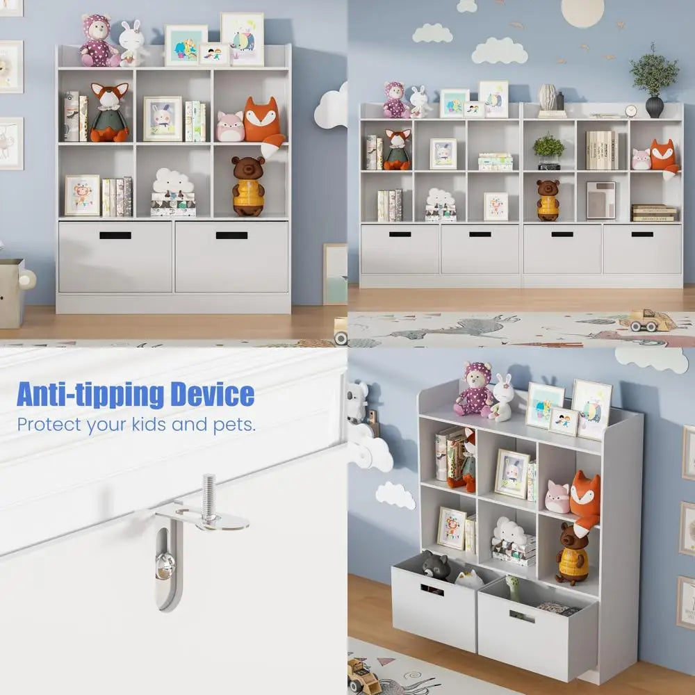 This wooden bookcase offers a generous storage solution with six open shelves and two fabric drawers, providing ample space for your belongings while also being child-friendly in height. The bookshelf's upgraded design with cloth drawers adds an extra layer of privacy to your storage needs. Measuring 39.1 inches in length, 11.8 inches in depth, and 45 inches in height, it's a versatile piece that can serve as a display, file, or general storage cabinet. Suitable for various rooms including bedrooms, living rooms, hallways, and offices, its durability and stability are ensured by its construction from CARB/EPA certified wood, which emits formaldehyde at levels of 0.09ppm or less, making it an eco-friendly choice. Metal anchors are included to prevent the bookcase from tipping, ensuring safety. The three-tier, eight-cube design of the bookshelf allows for organized storage with ample space between compartments, perfect for keys, books, CDs, magazines, and collectibles. Assembly is straightforward with individually packaged hardware components and clear, coded instructions for easy reference. Should you need assistance, our professional customer service team is ready to help and ensure a satisfactory experience.