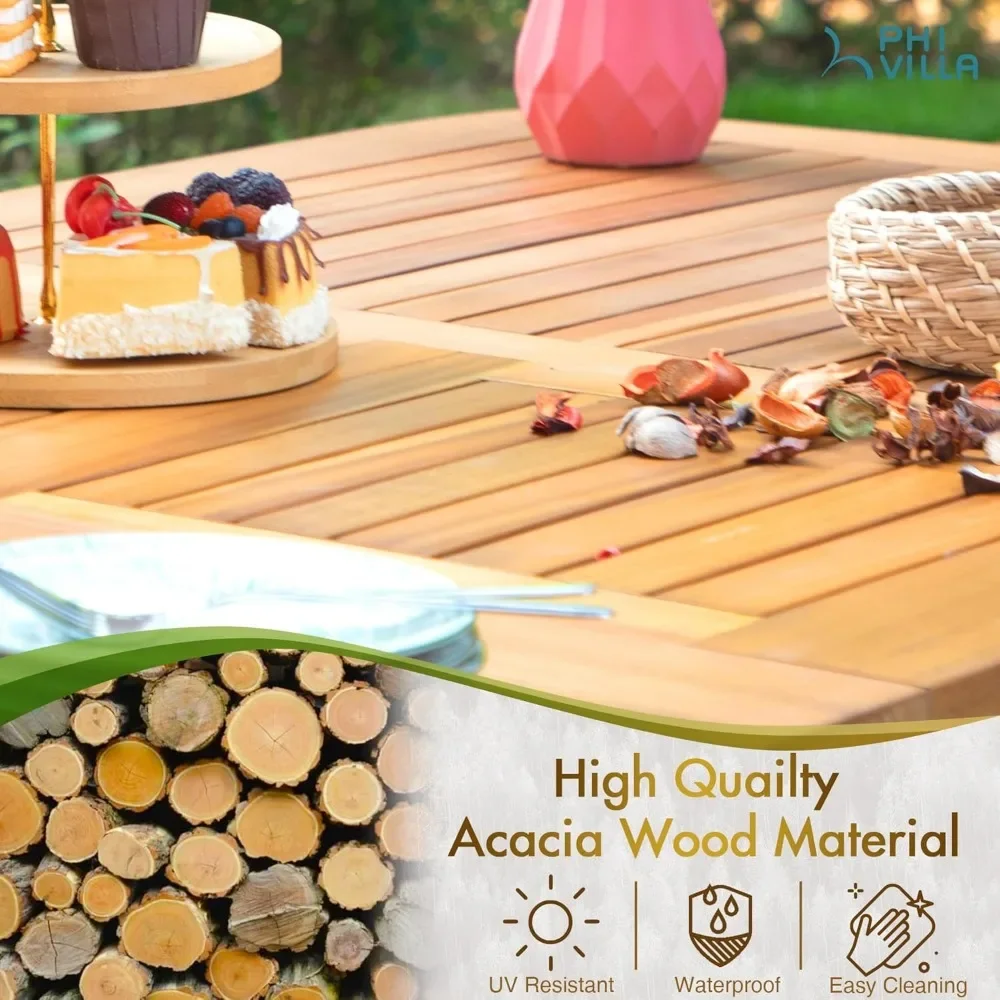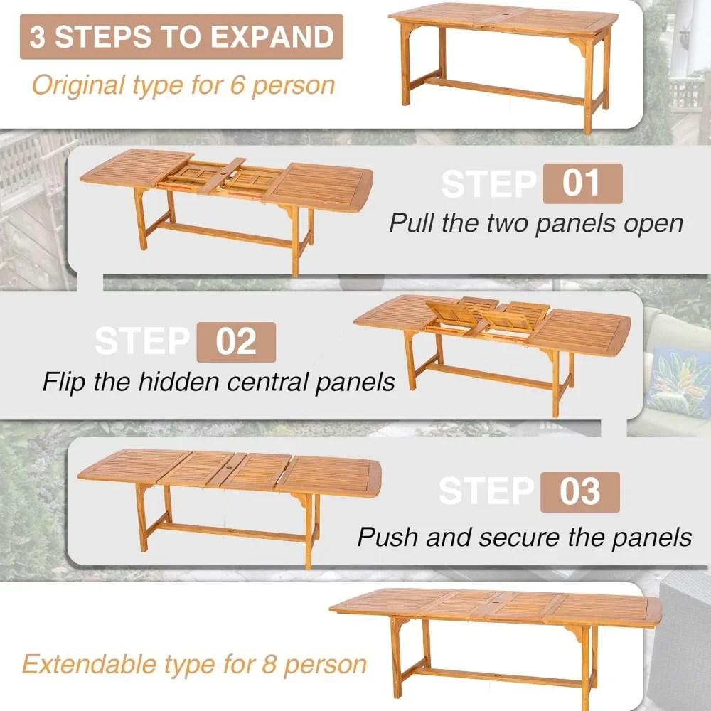 - Mesa de comedor de madera extensible: la mesa de comedor está hecha de 100% madera de acacia maciza, que cuenta con resistencia a los rayos UV y a la decoloración. Diseñada con función ampliable, la mesa se puede extender para cenas de 6 a 8 personas girando los paneles centrales ocultos, lo que es conveniente y útil.