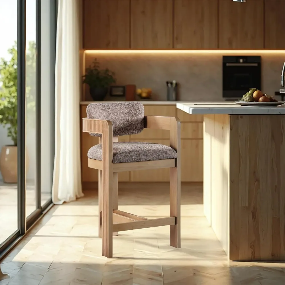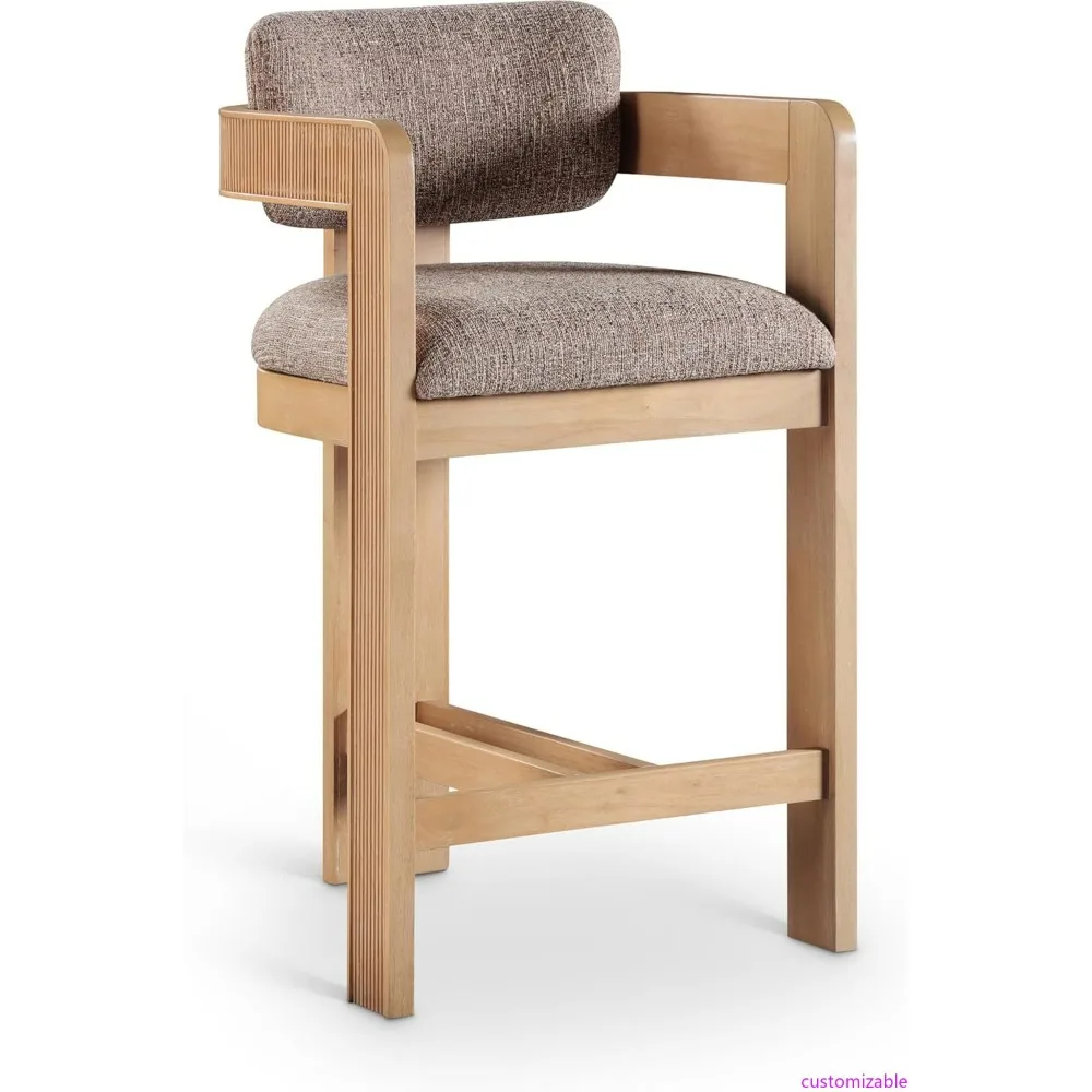 This item features a linen textured fabric made from polyester, offering a rich brown color with a two-tone weave pattern. The overall dimensions of the product are 20.5 inches in width, 21 inches in depth, and 37.5 inches in height. The frame is constructed with solid wood finished in a natural tone, complemented by fluted wood detailing.