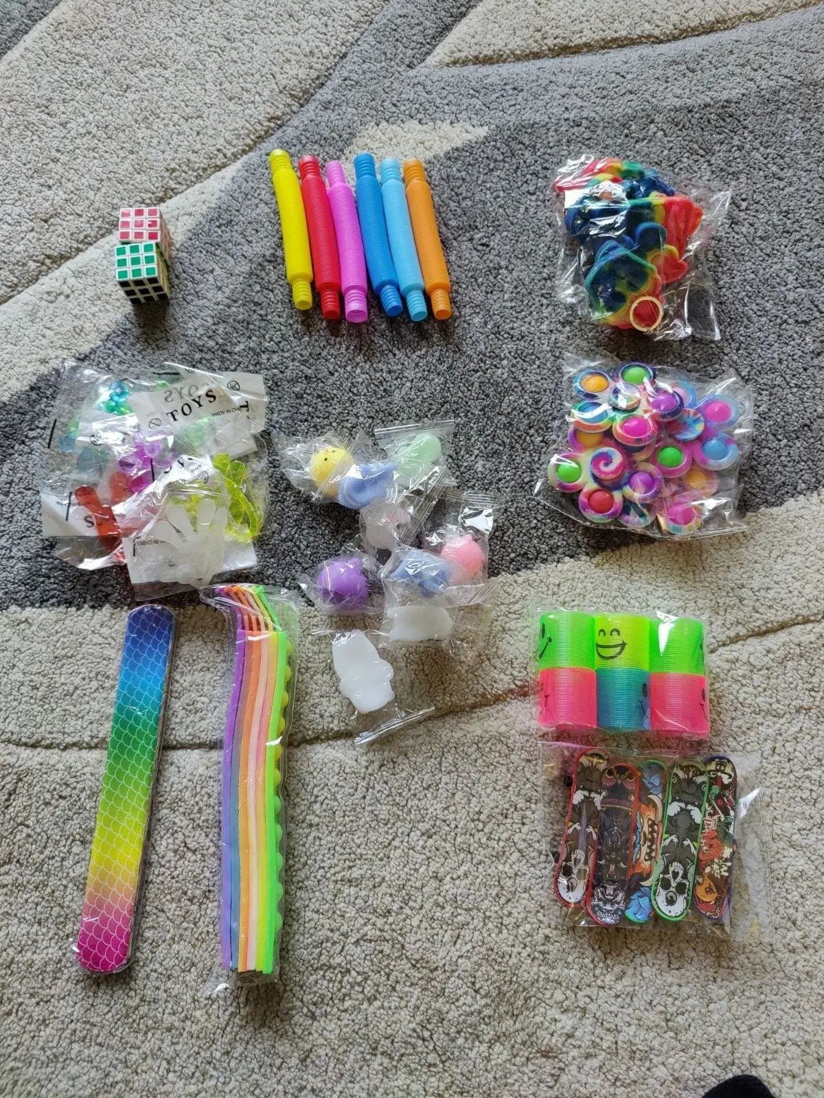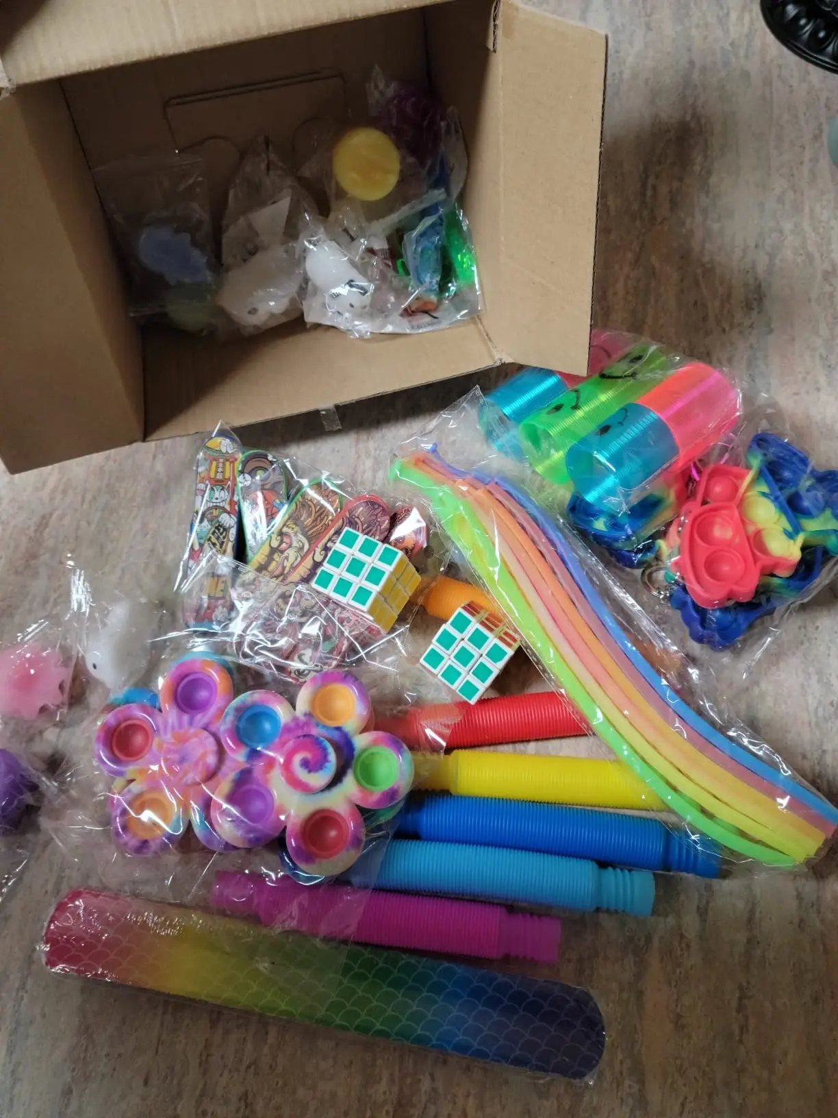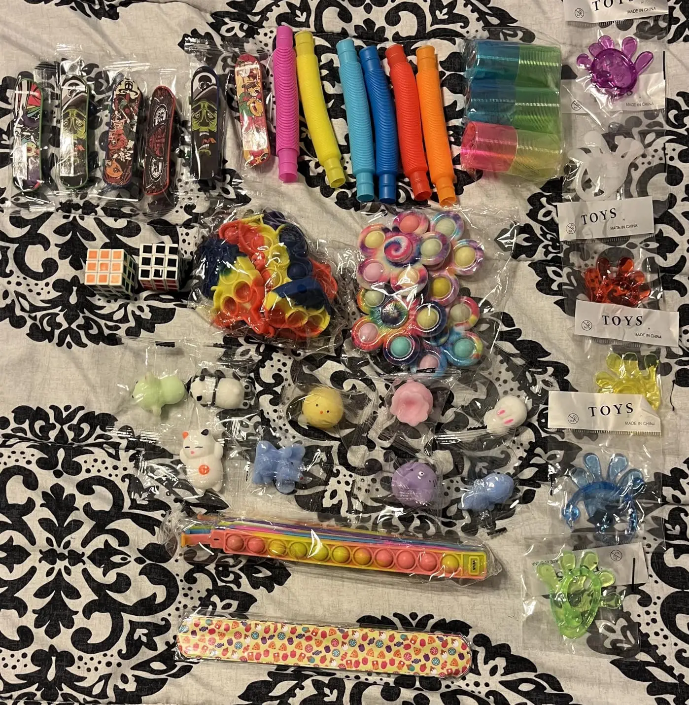 Includes: 14 kinds of popular and trending fidgets, 4 Mochi squishy toy, 4 fidget spinner, 2 squeeze ice cube, 2 pop spinner, 2 animal popper, 2 strechy man, 1 fidget cube, 1 fidget controller, 2 fidget toys, 3 animal wobblers, 3 spinning pop, 3 marble & mesh, 2 pop tubes, 4 elastic rope, 2 fingertip balls.