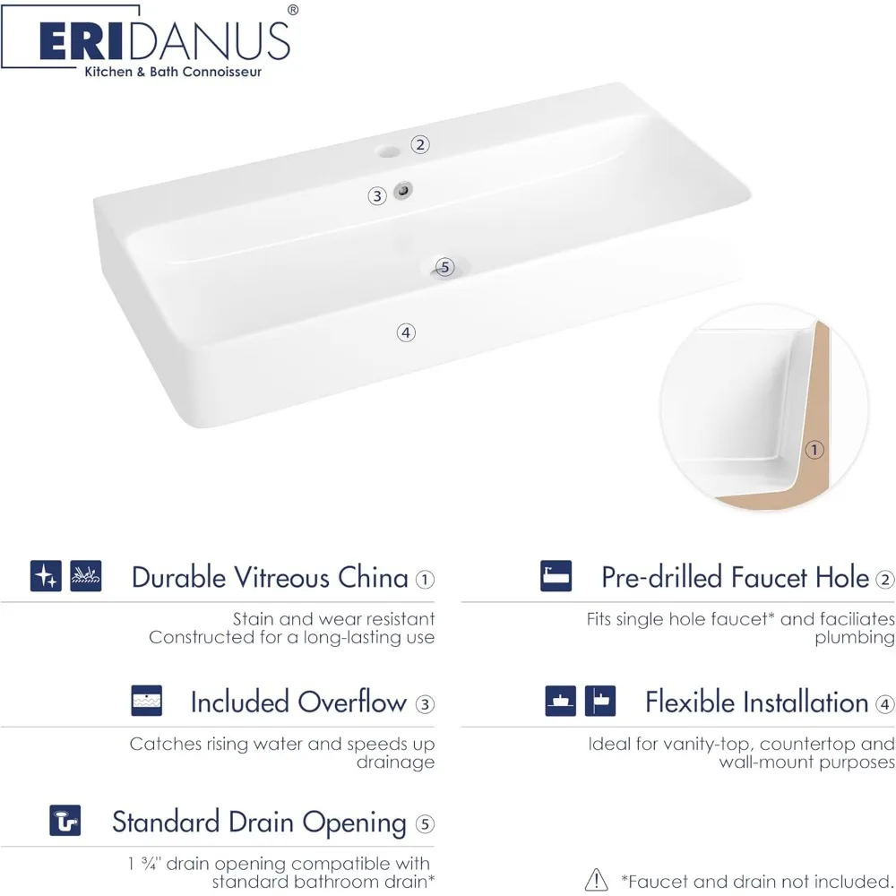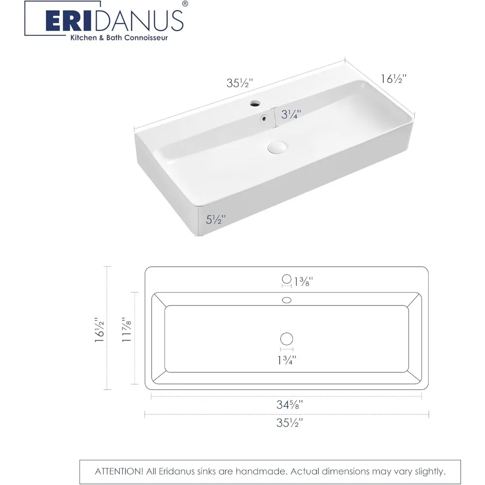 - Bathroom Sink: Exterior dimensions: 35.5 x 16.5 x 5.5 inches, larger and deeper, included chrome finished overflow to catch rising water and improve draining speed. This wall-mounted bathroom sink boasts a sleek and modern design that will add a touch of elegance to any bathroom decor.