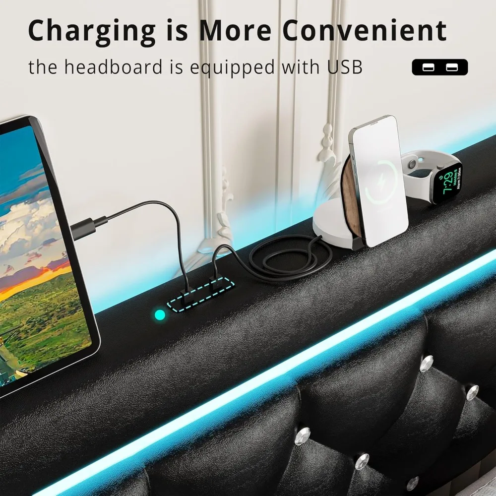 - Adjustable Upholstered Headboard:It uses soft PU leather, a high-density sponge, and crystal tufted buttons, providing a comfortable backrest for reading with LED light. The headboard can be adjusted to 42.3" or 46.3" to accommodate mattresses from 10" -14".