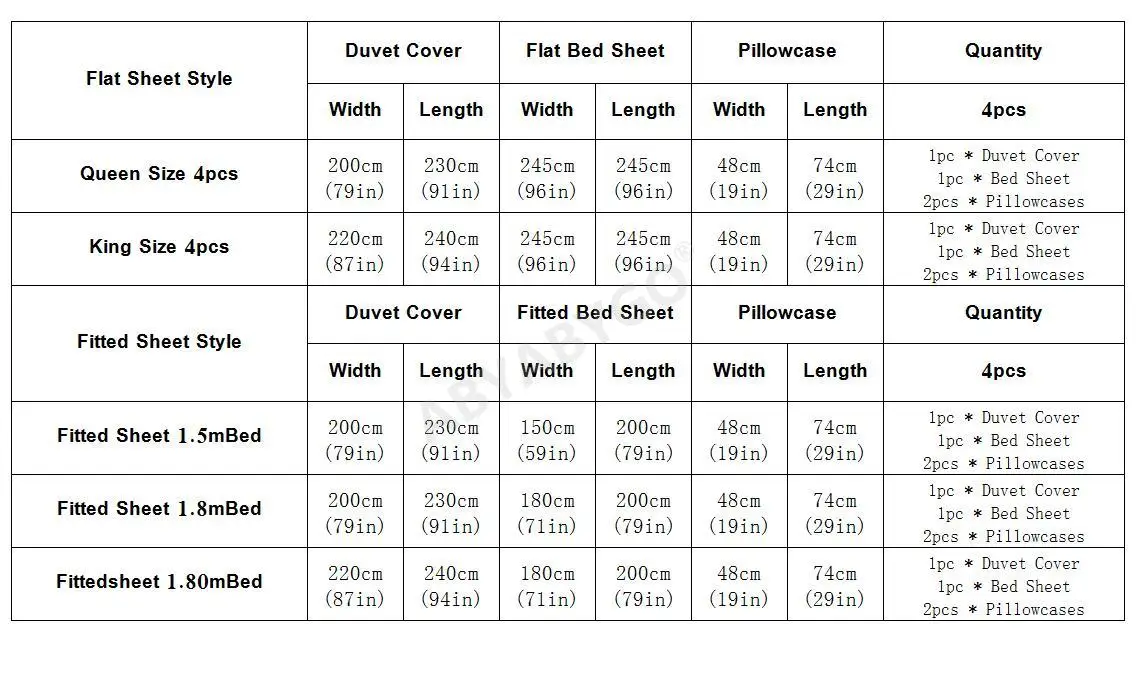 Duvet cover: 200x230cm Fitted Bed Sheet: 180x200cm Pillowcase:48x74cm x2