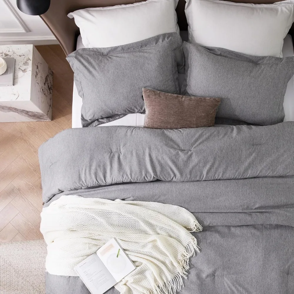 Here's a rewritten product description based on the provided information: --- Discover the ultimate in softness and comfort with our luxurious microfiber comforter. This extra-soft bedding offers a gentle touch against your skin, providing year-round warmth without the risk of overheating. Its subtle heathered pattern, achieved through cationic dyeing, adds a casual yet timeless charm to any bedroom, complementing a variety of decor styles. This versatile comforter features four corner loops, allowing it to be used as a standalone blanket or easily secured inside your preferred duvet cover. It's perfect for all seasons and suits a range of temperature preferences. Maintenance is a breeze with this comforter, as it can be machine washed in cold water on a gentle cycle, ensuring it stays looking fresh even after months of use. This makes it an ideal choice for busy households and those with pets. Our complete bedding set includes a super king-sized comforter measuring 120" x 120" and two matching pillow shams, each measuring 20" x 36" with an additional 2" for a tailored look. This set offers excellent value and makes for a thoughtful gift for housewarmings or holidays. --- This description maintains the original meaning while avoiding the use of specific chemical terms, after-sales information, and special characters.