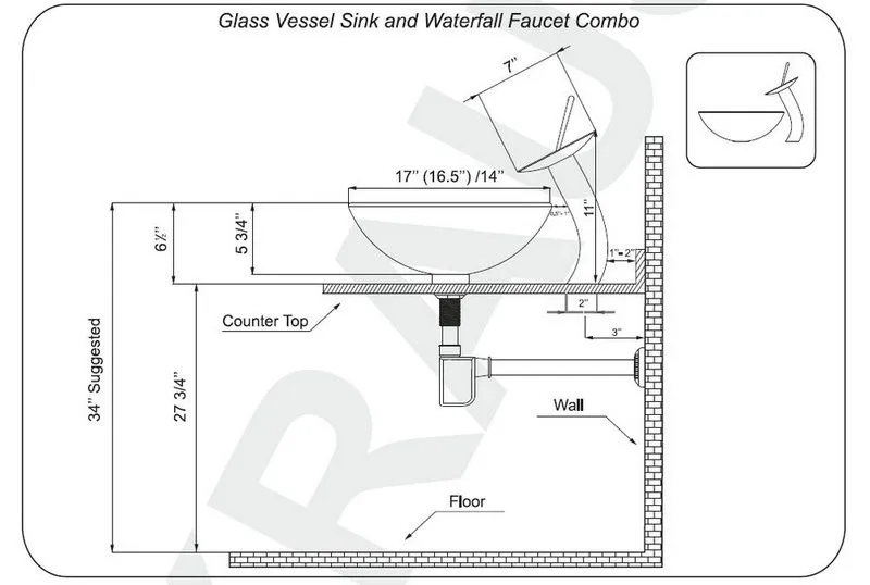 Measurement: 22.4" (560 mm) sink length, 14" ( 350 mm) sink width, 6.6" (165 mm) sink height ; 11.4" ( 285 mm) faucet height, 7" ( 175 mm) spout height.