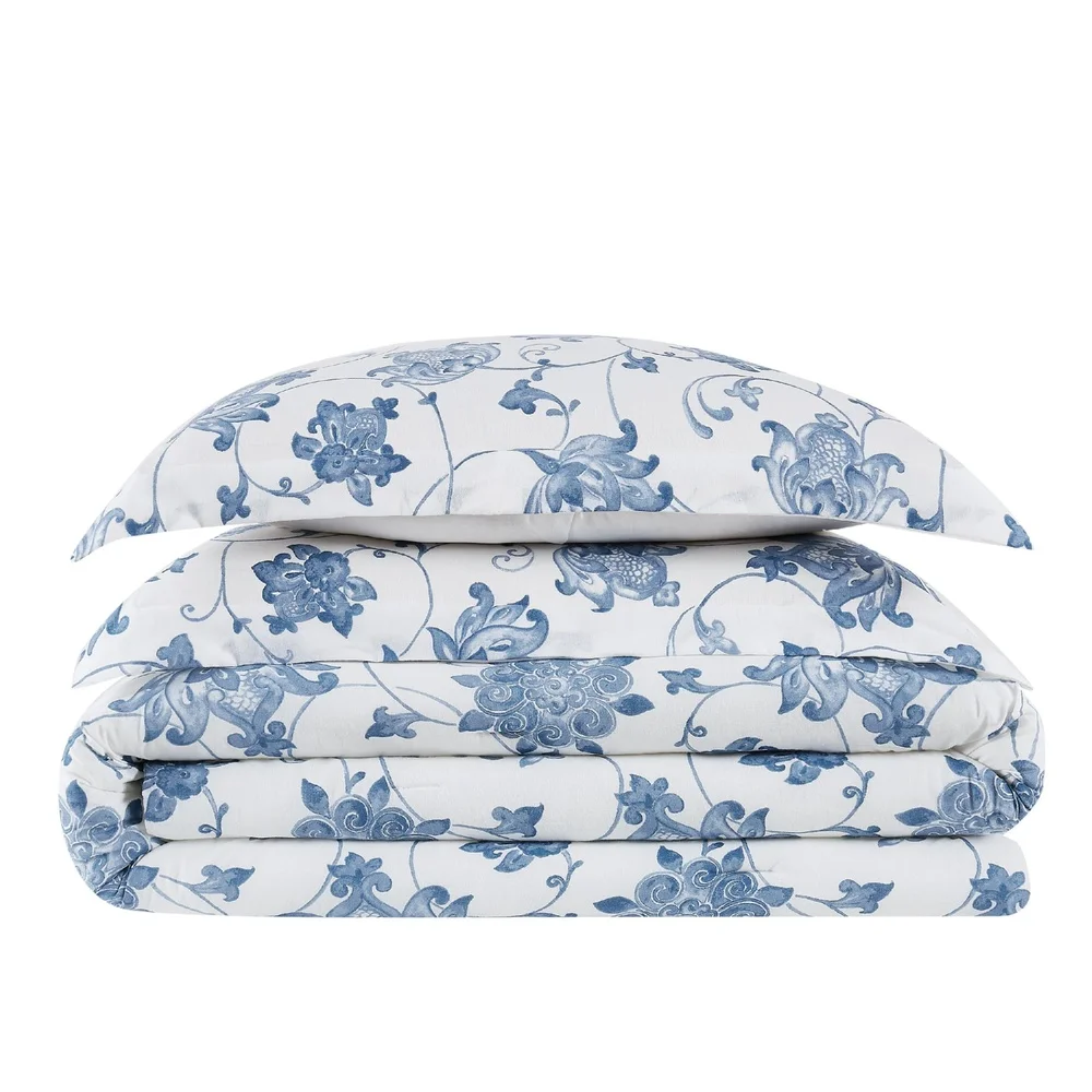This classic blue and white toile pattern is a great addition to a traditional or modern farmhouse style room. The 100% cotton fabric face cloth is printed on a white base cloth with a blue floral vine pattern in blue shades. The reverse is a solid pure white color. Includes: one twin XL comforter 68x90 inches and one standard sham 20x26 inches. Face fabric is printed 100% cotton woven cloth. The reverse is 100% brushed microfiber in a solid white color. Comforters are filled with 100% polyester fiber filling. This item is machine washable, but please be sure to use appropriate sized machinery to avoid any excess wear on the items. This item is manufactured and imported from China.