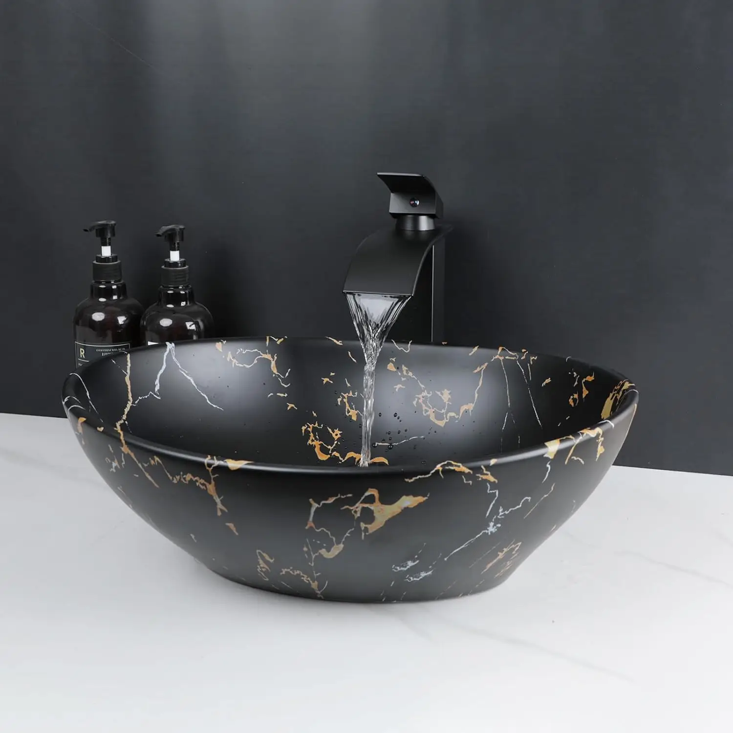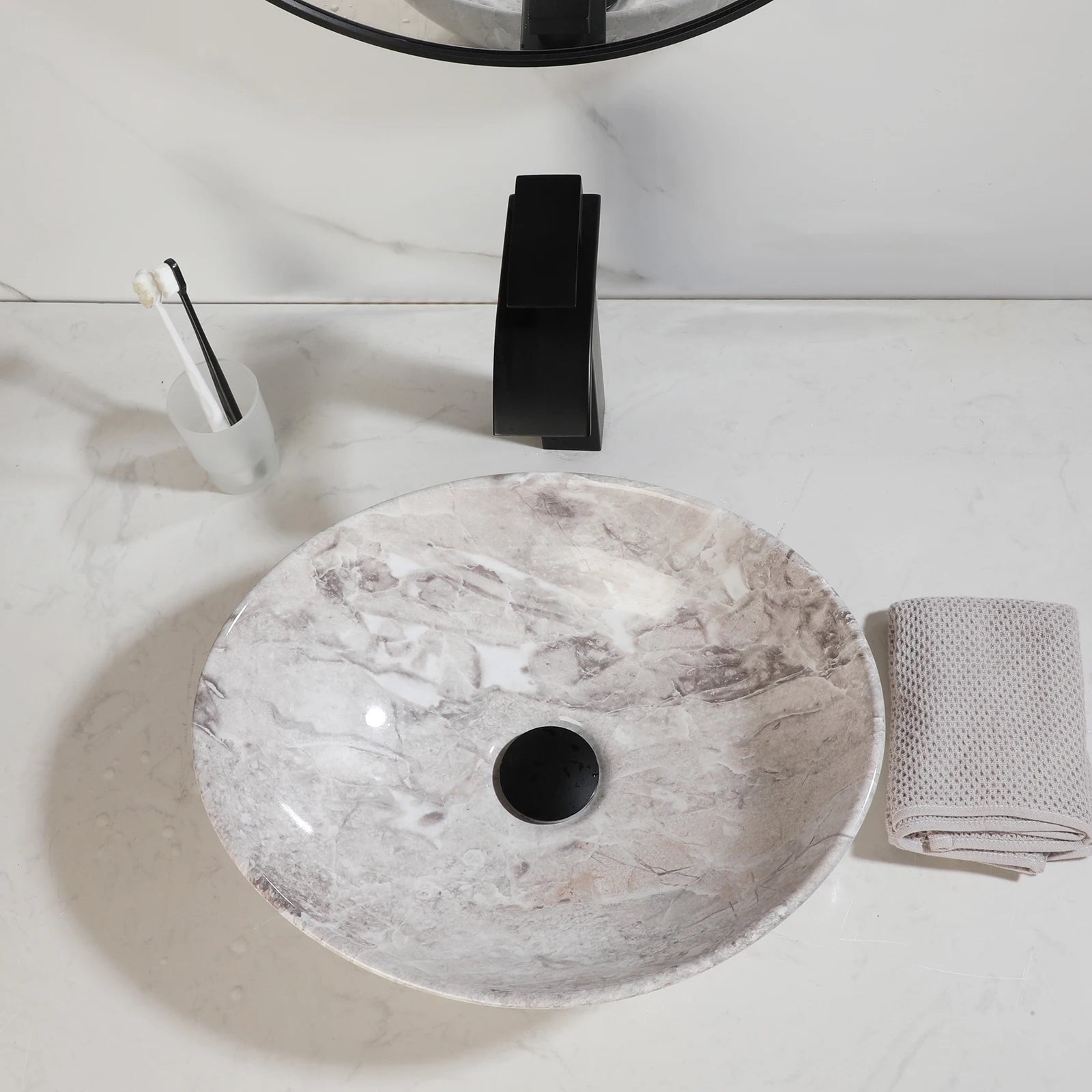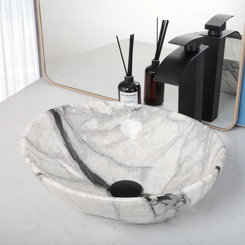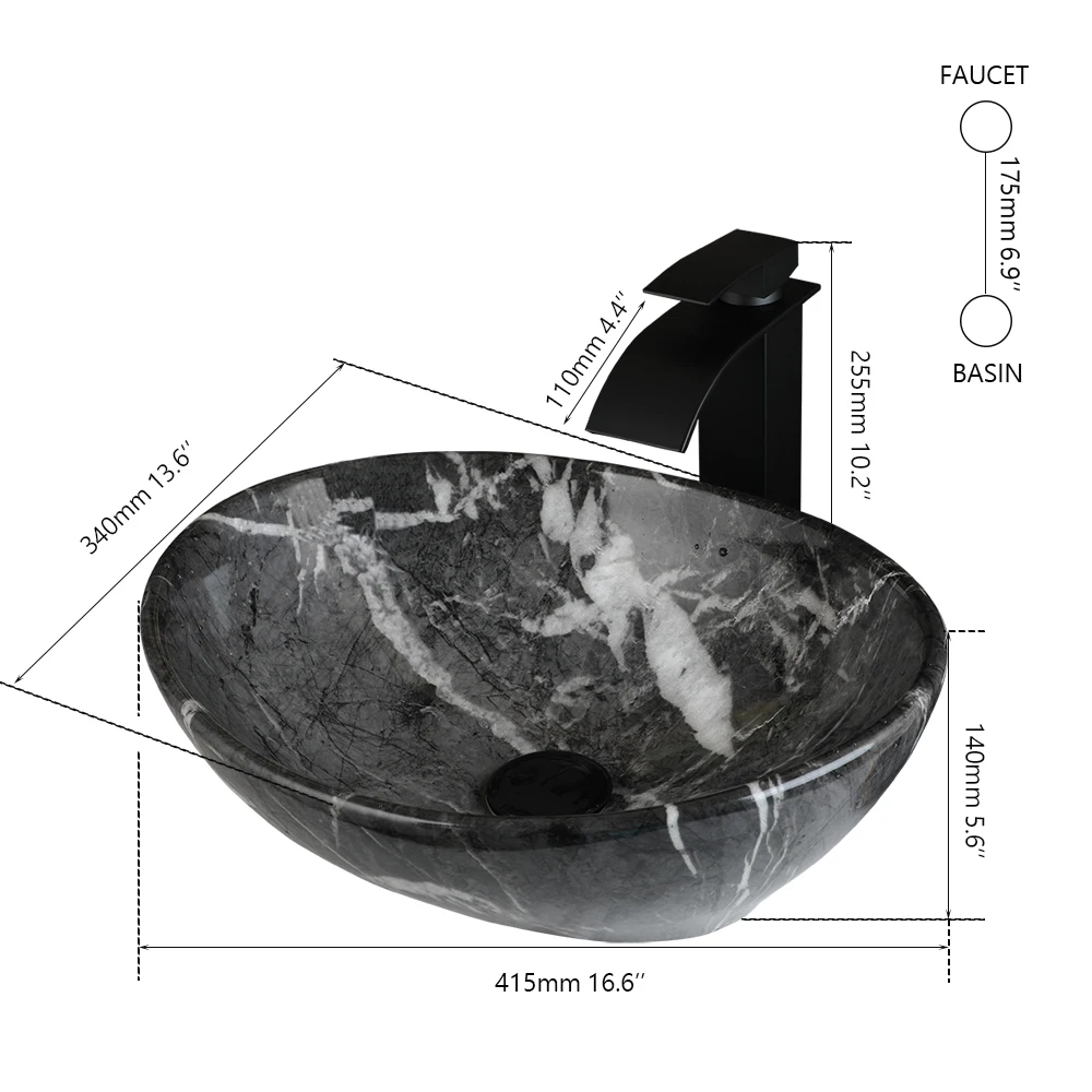 ★【Unique Marbling Design & European Modern Sleek Style】Our oval bathroom sink pays more attention to the personalized appearance design, which combines romance and nature. It seems to be a work of art, which inadvertently gives people a sense of shine and becomes the eye-catching focus in the bathroom.Add high-style to any bathroom or bar vanity with this vessel sink,let the bathroom life exude its unique charm.