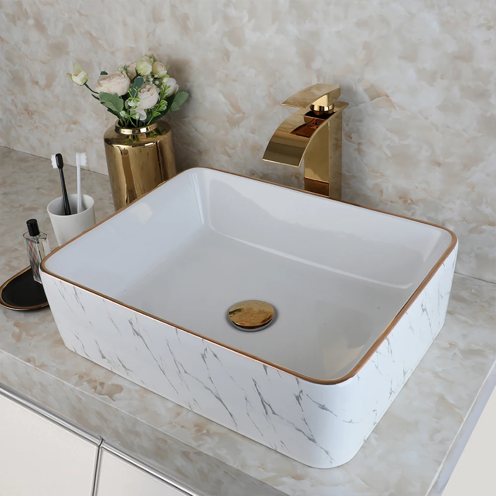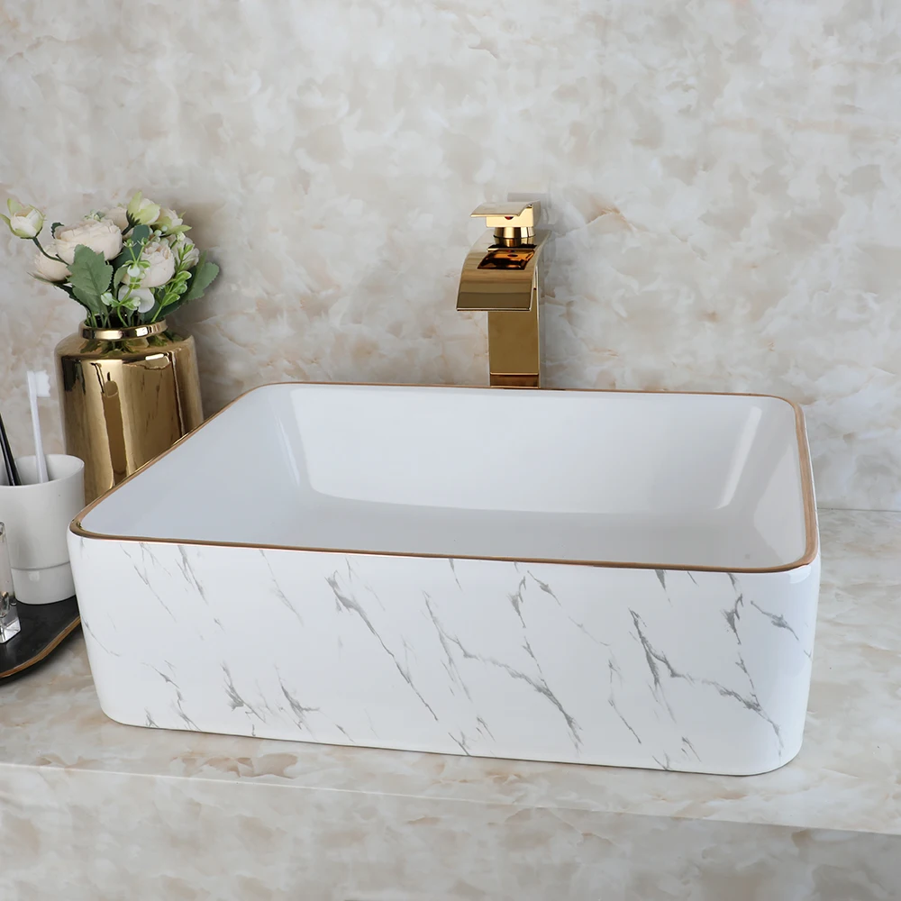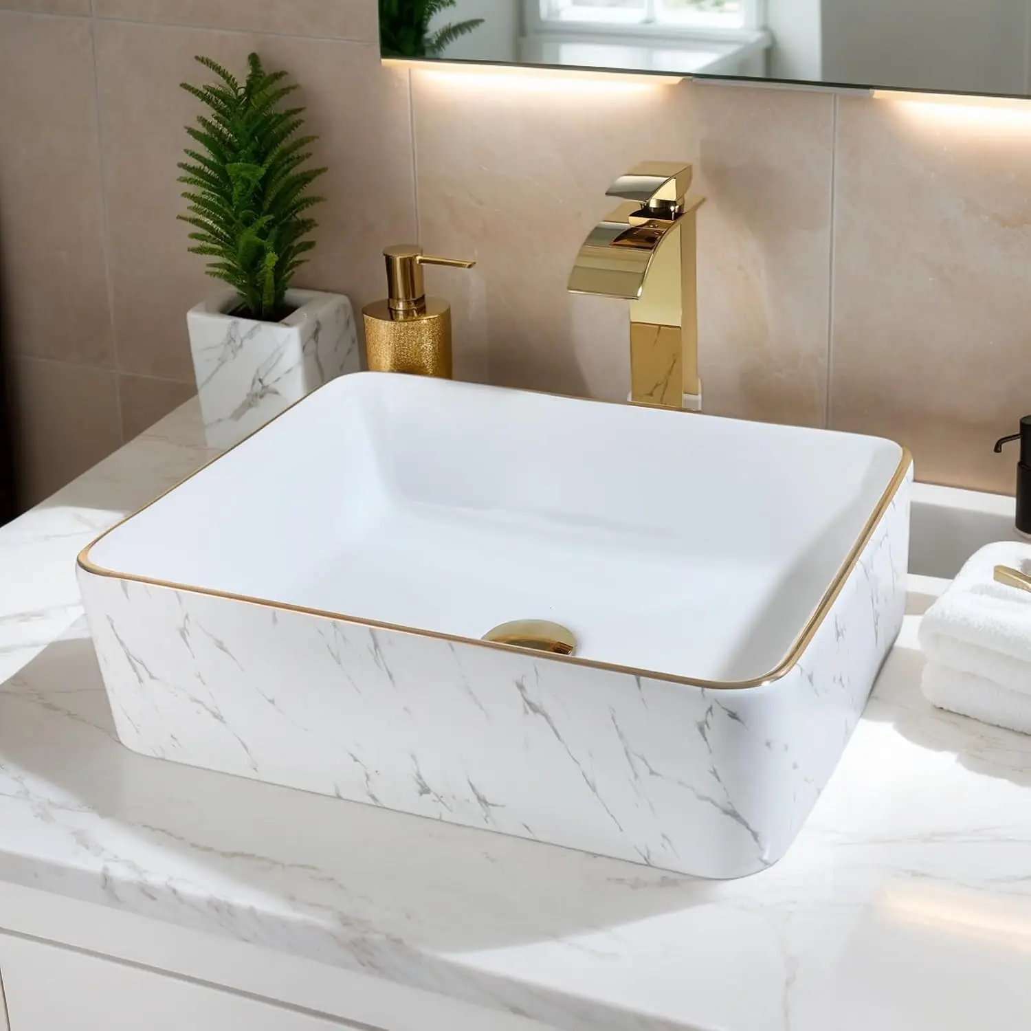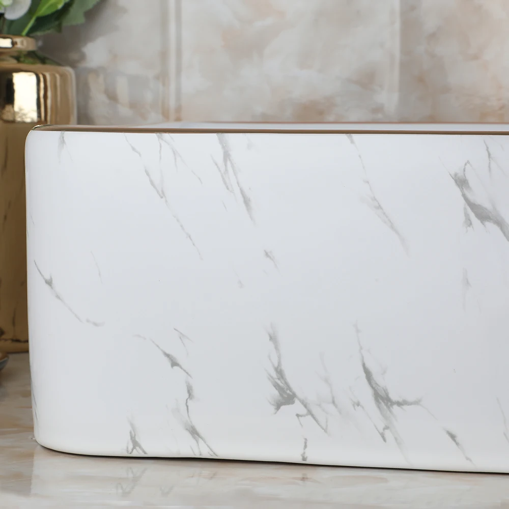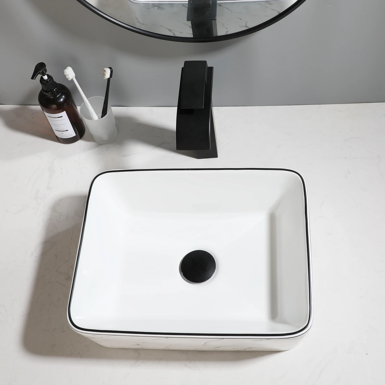 - Elegant Design: Featuring a modern rectangular shape and marbling pattern, this above counter bathroom vessel sink adds a touch of sophistication to your bathroom. The black trim on the top adds an extra element of elegance, making it a perfect choice for those seeking a contemporary aesthetic.