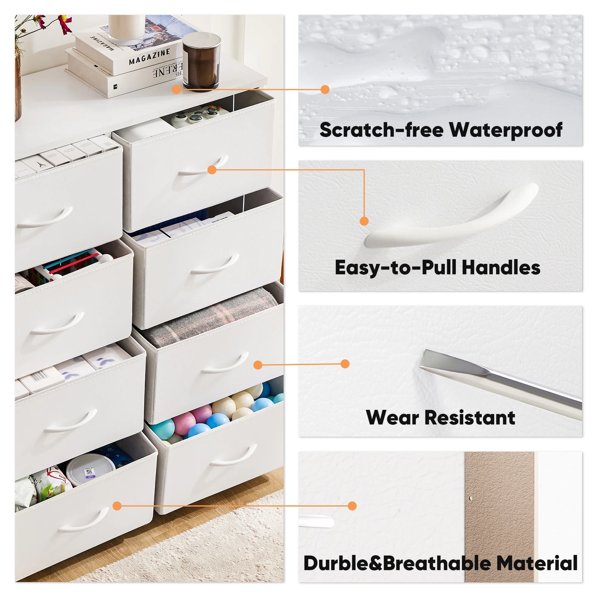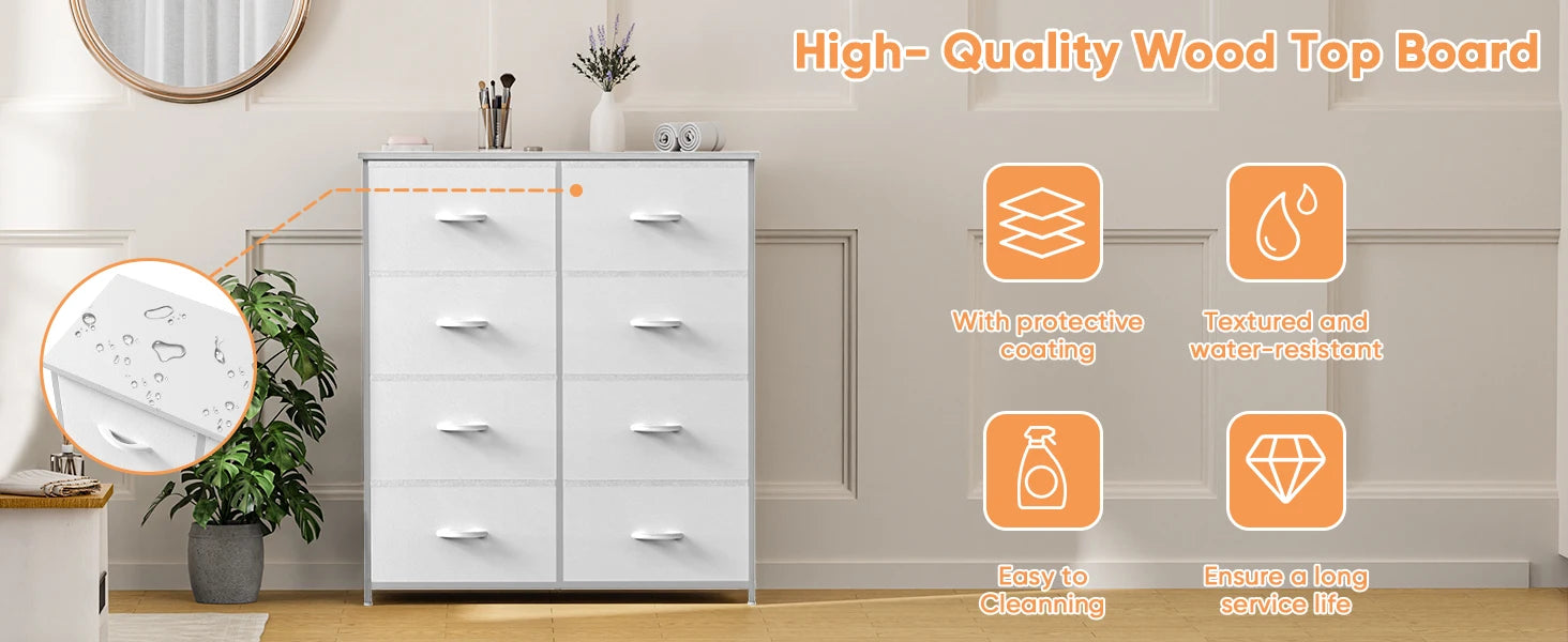 【Plenty Storage Space】With 8 large drawers, this dresser offers generous storage capacity. You can organize your belongings neatly by dividing the compartments. Each drawer can accommodate at least 12 adult T-shirts or 7 pairs of jeans, while it's also ideal for socks, underwear, toddler toys, etc. If you have multiple dressers, they can be stacked to save space.