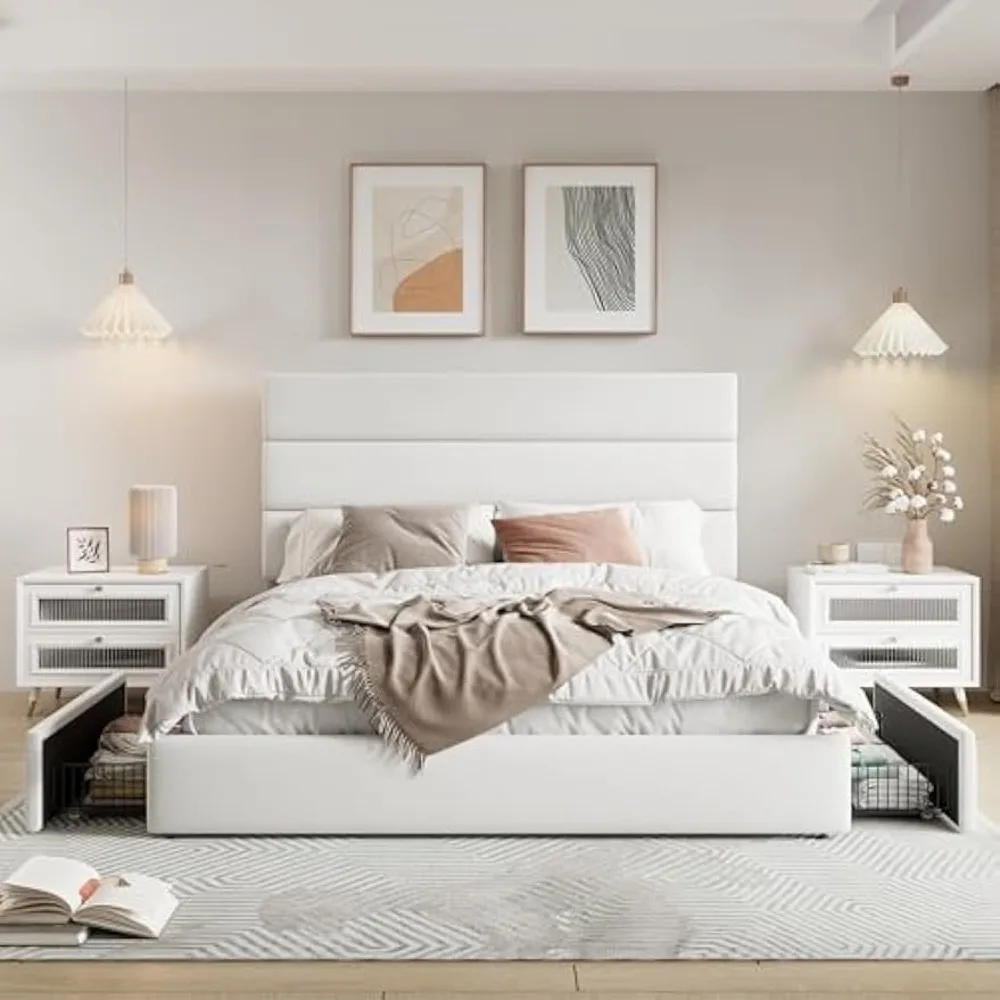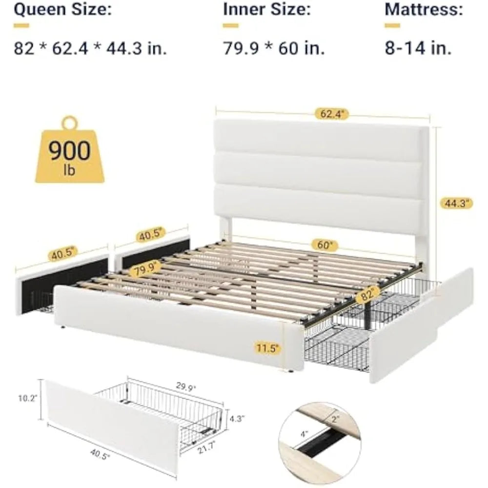 This queen-sized bed offers ample under-bed storage with four large pull-out drawers on smooth, silent rollers, providing hidden space for bedding, seasonal clothing, or shoes while maximizing organization without taking up additional floor space. The bed is wrapped in ultra-soft, high-density velvet fabric, adding a touch of luxury and warmth to your bedroom decor while being resistant to everyday wear and tear. The three-panel, foam-filled headboard provides plush back support for reading or lounging, combining comfort with contemporary style. The bed frame is robustly constructed with reinforced steel side rails and a sturdy wooden slat system for excellent weight distribution and stability, eliminating the need for a box spring. All components of this queen size bed are neatly packed in one box, with each part clearly labeled for easy assembly.