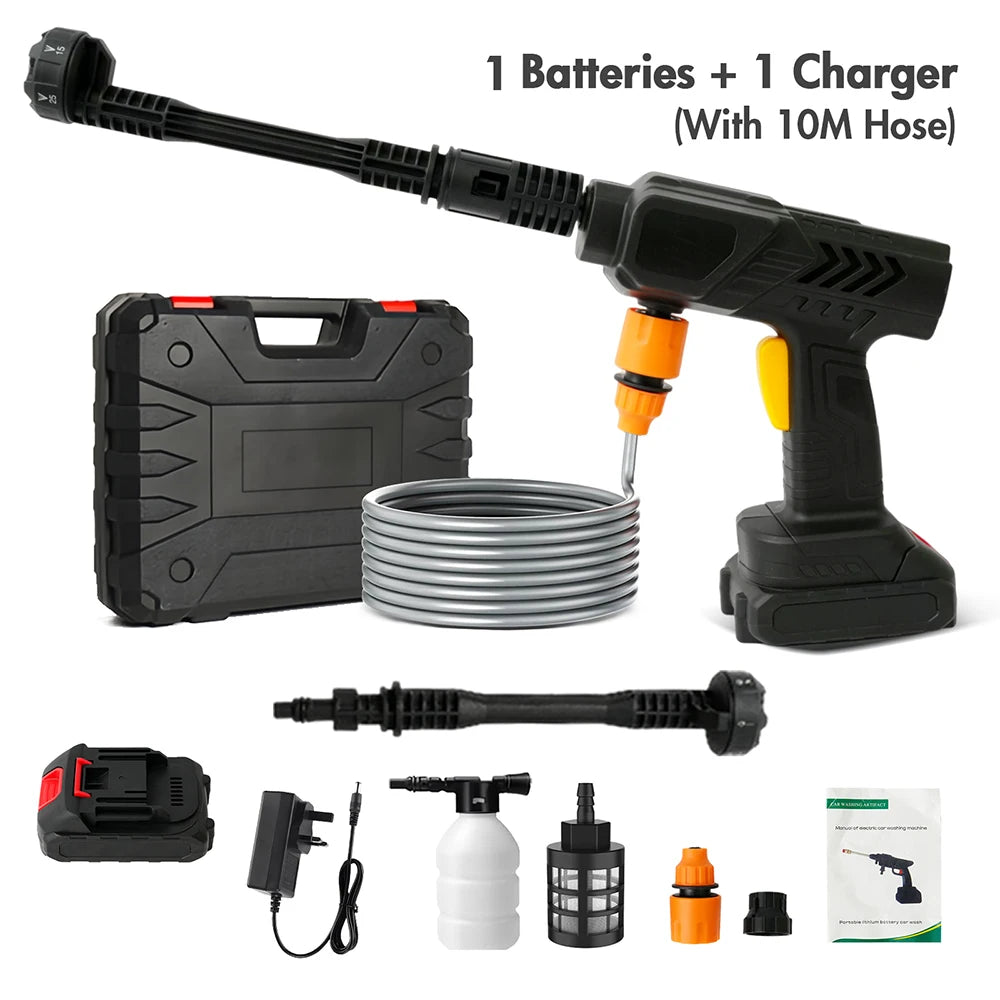 This cordless pressure washer combines powerful performance, intelligent control, and portable design to deliver a revolutionary cleaning experience. Equipped with a pure copper motor, it generates ultra-strong water pressure up to 500PSI and operates at 3200rpm, effortlessly removing stubborn grease and heavy dirt with long-lasting efficiency. The innovative 6-in-1 multifunctional nozzle offers multiple spray patterns including high-pressure jet and fan spray, allowing quick switching for various scenarios like vehicles, courtyards, and exterior walls. Powered by a 21V high-capacity lithium battery, it eliminates cord restrictions and supports water intake from taps, rivers, or buckets for ultimate outdoor freedom. The included 32.8ft reinforced wear-resistant hose features a precision filter to protect core components and extend lifespan. Intelligent temperature control and overload protection systems ensure safe operation, while the lightweight ergonomic design makes cleaning effortless. Perfect for car care, household cleaning, or outdoor use, this pressure washer is your indispensable cleaning companion!