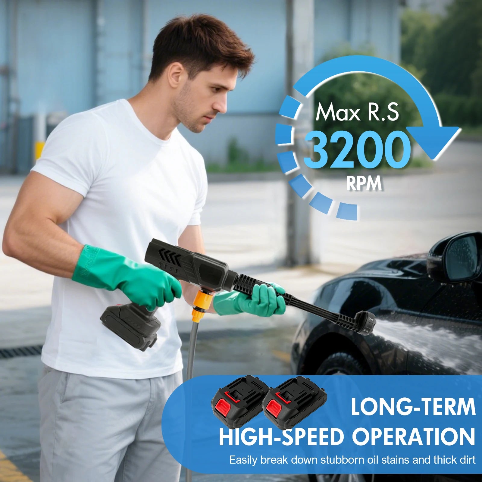 [Powerful & Efficient] The cordless pressure washer features a pure copper motor delivering 500PSI water pressure and 3200rpm speed for stable, robust performance. Copper construction ensures superior conductivity and heat dissipation, maintaining high efficiency during prolonged use. Easily tackles tough stains and grime for maximum cleaning results.