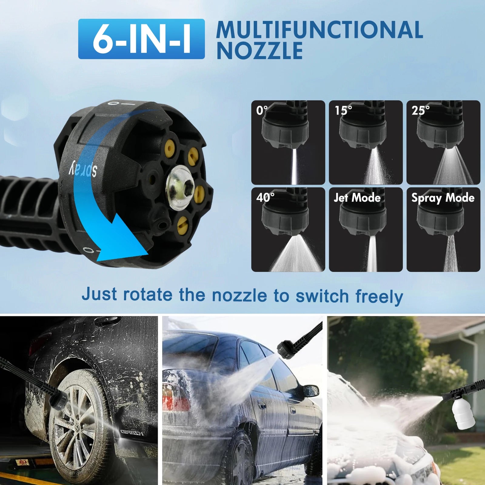 6-in-1 Nozzle Cordless Pressure Washer 21V 500PSI Electric Power Washer with 10M (32.8FT) Hose for Floor Cleaning Car Washing, Watering Plants & Pet Cleaning