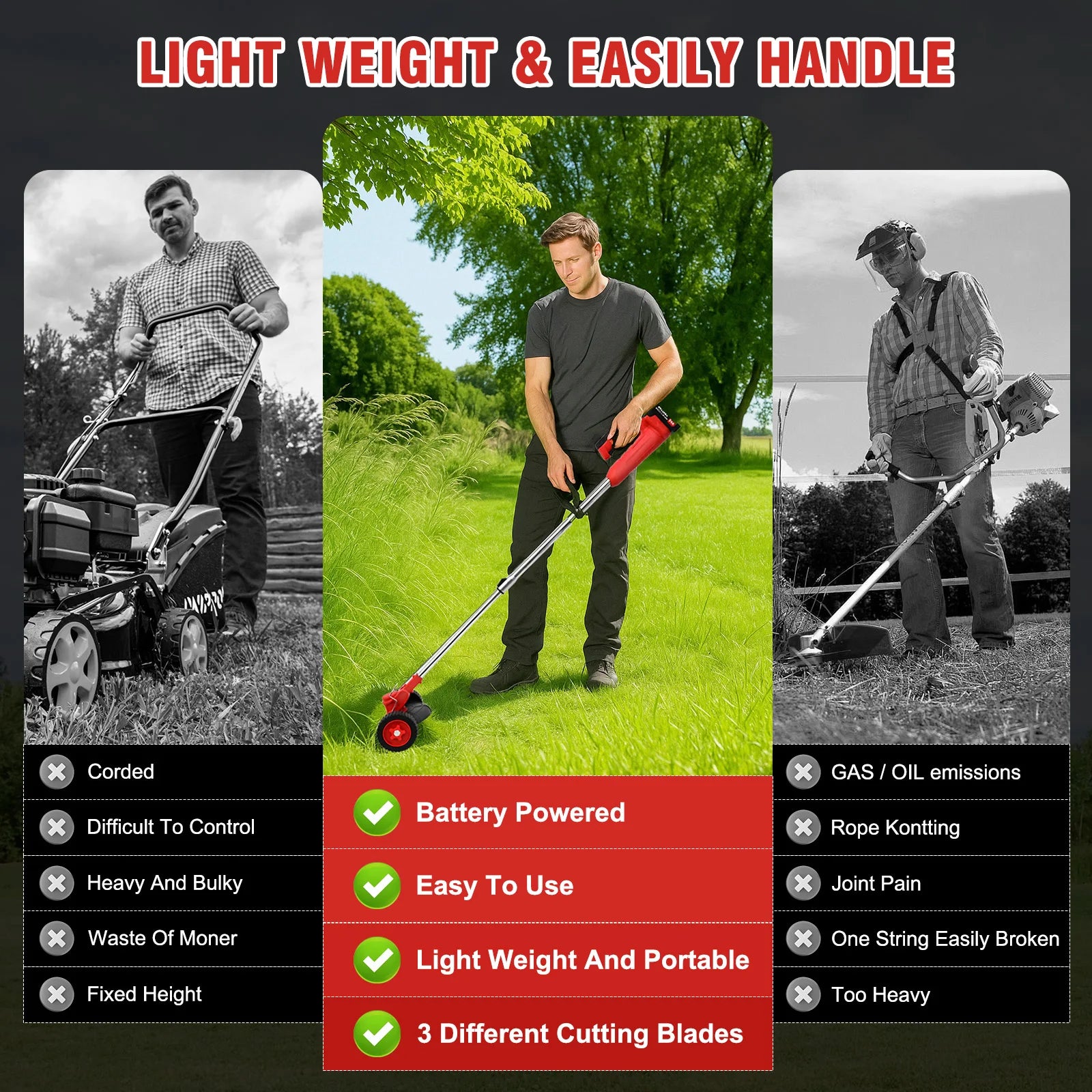 Cordless Weed Wacker Electric Grass Trimmer 3-in-1 Brush with Wheels Edger and Trimmer