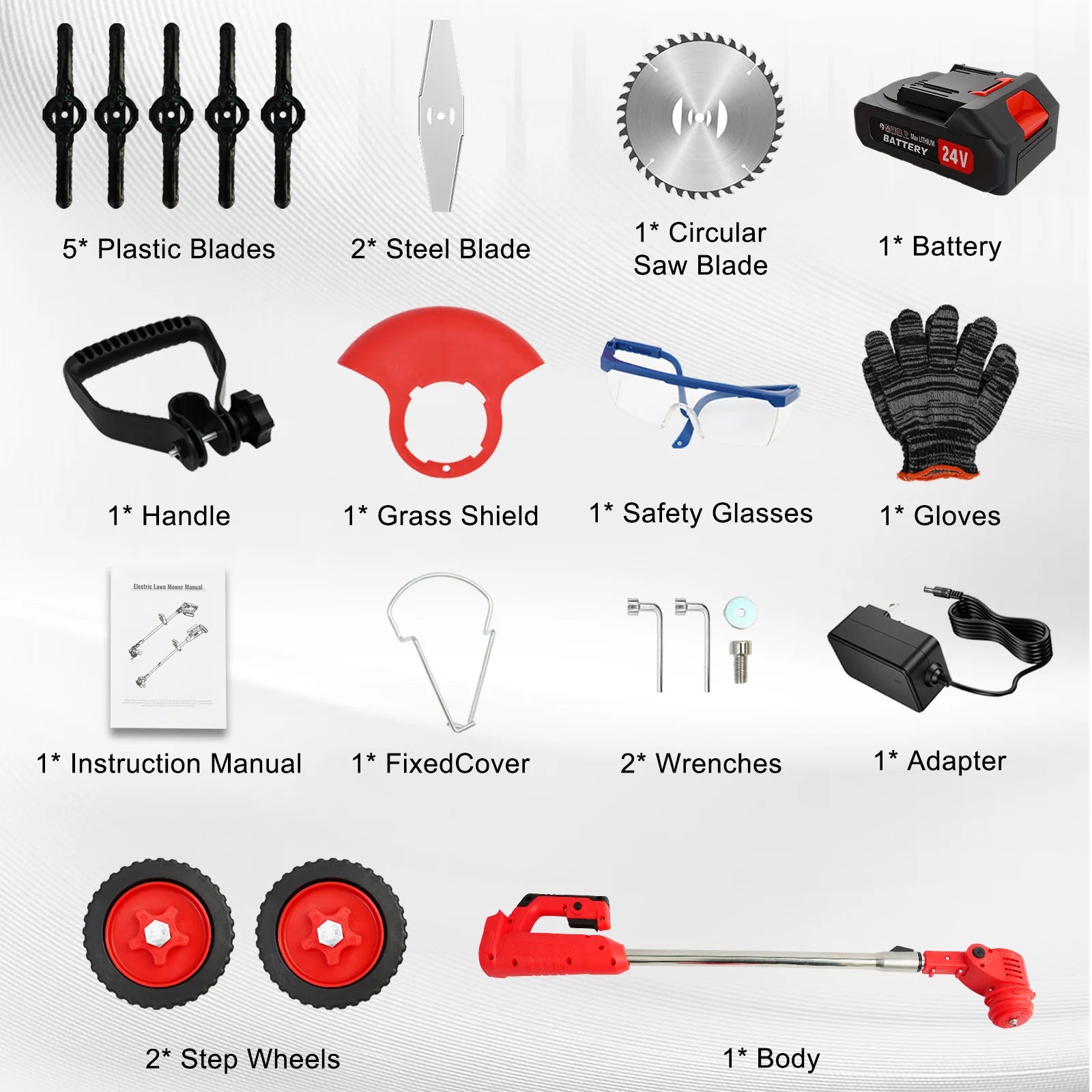 【Three-in-One Blades for Various Challenges】The cordless grass trimmer comes with three types of blades. Plastic blades are designed for soft lawns, easily removing weeds and refreshing your lawn. Stainless steel blades are tough and durable, suitable for trimming stubborn weeds and small shrubs, keeping your garden neat. The alloy saw blade is for thick bushes, branches, and seedlings, powerful and unyielding to any challenge. Be sure to choose the correct blade to protect the trimmer and extend its lifespan.