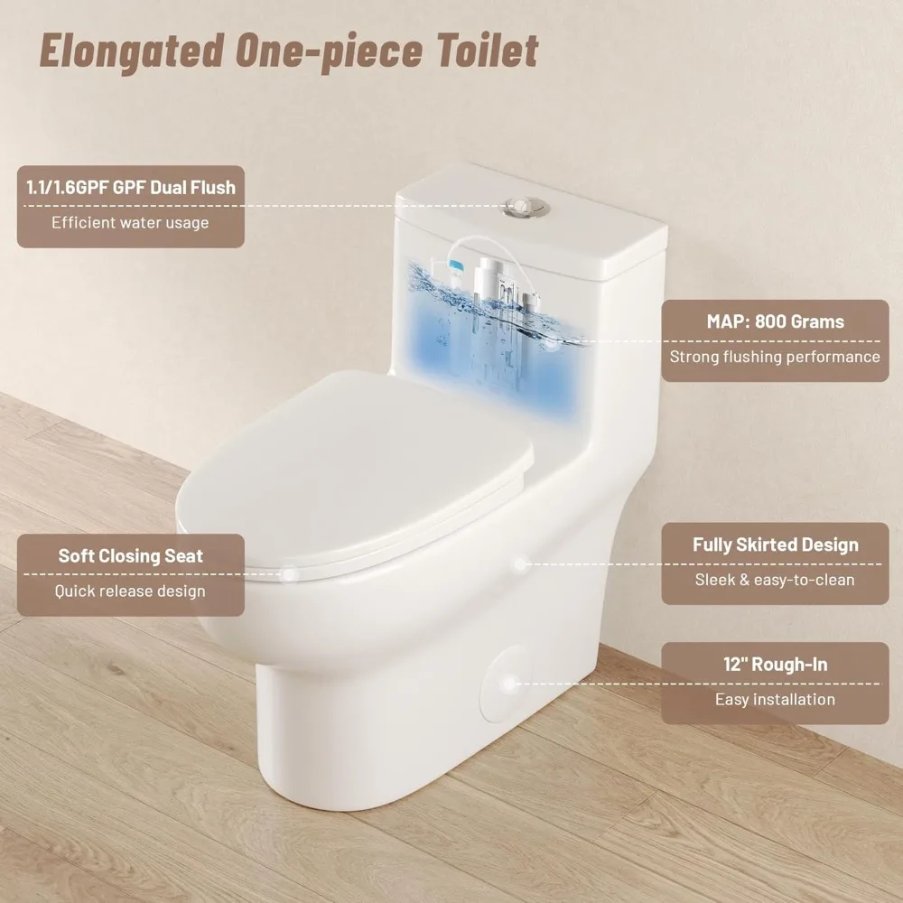 This product description highlights the features of a modern and comfortable one-piece toilet: - Dimensions: The toilet measures 28.75 inches in length, 14 inches in width, and 28 inches in height, offering a sleek design and superior comfort. It features an elongated bowl and a standard seating height of 16 7/8 inches for a relaxing bathroom experience. - Dual Flush System: The toilet is equipped with a powerful dual flush system that operates at 1.1 gallons per flush (GPF) and 1.6 GPF, conserving water while providing a strong flush. This can save up to 16,500 gallons of water per year compared to older 3.5 GPF models, making it an eco-friendly choice for the bathroom. - Easy-Clean Design: The skirted design of the toilet eliminates hard-to-reach areas, and the premium glaze on the surface resists stains, scratches, and yellowing, ensuring the toilet maintains its appearance over time. - Installation: The toilet is designed for easy installation with large side access holes for simpler mounting. Installation guides are available, and the process typically takes just a few hours with basic plumbing assistance. - After-Sales Service: The company is dedicated to providing high-quality bathroom products and stands behind the quality of their items. They offer lifetime after-sales service and a 12-month warranty for their one-piece toilets, with customer support available via email through the platform.
