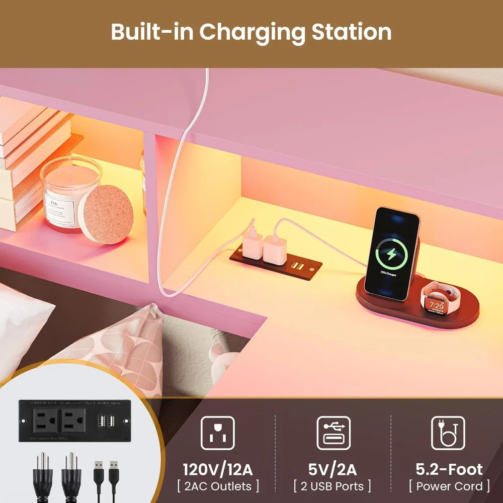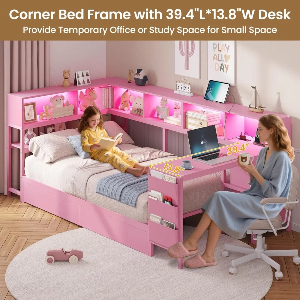 - 【Corner Bed with Desk and Charging Station】DICTAC pink twin bed frame with a 39.4" Lx 13.8" W Study Desk at the end of the bed, providing ample space for your or your child's laptop, iPad, and stationery. This innovative design can easily turn your bedroom into a temporary work, rest, entertainment, or reading corner, and the built-in charging station on the right shelf contains 2 outlets and 2 USB ports, which is convenient for charging mobile phones, laptops, iPads, or gaming devices.