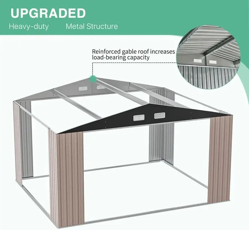 Spacious & Secure Storage: Our upgraded Metal Garden Shed is designed for practicality and durability: Roof Dimensions: 11.9'Lx9.8'W×6.4'H – Providing ample coverage for stored items. Base Dimensions: 11.5'Lx9.4'W×6.4'H– Optimized for stability and compatibility with standard outdoor spaces.
