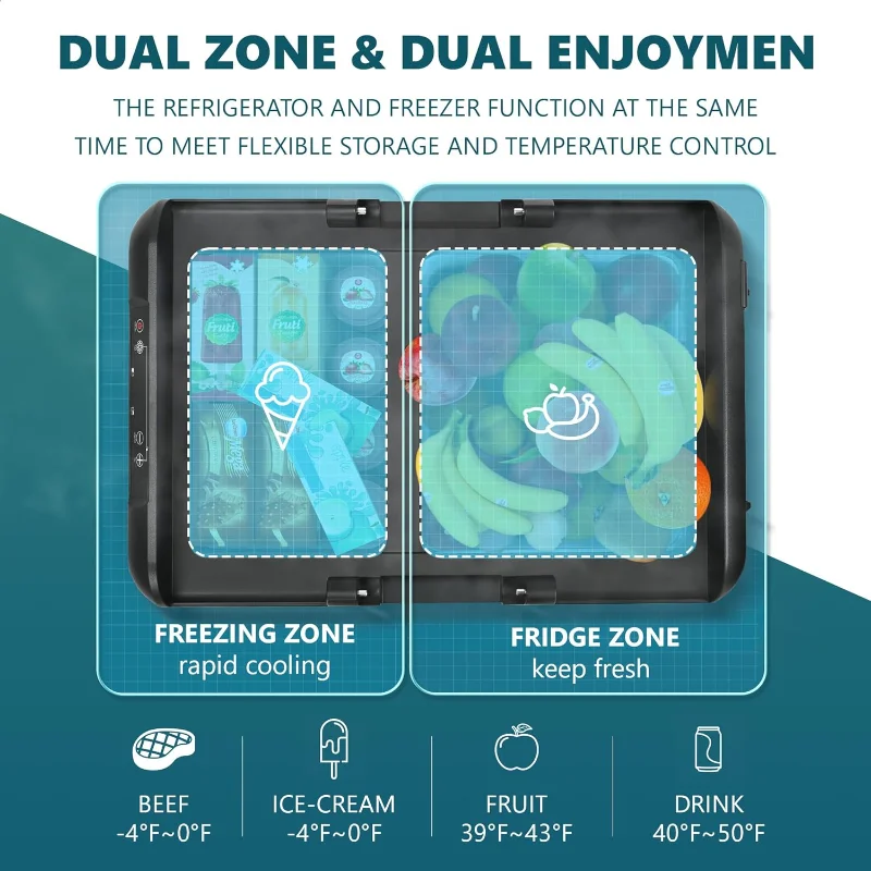- Dual Zone & Dual Temp Control; Equipped with two separate compartments, this car fridge offers the flexibility to use one as a fridge and the other as a freezer, each with its own temperature settings. With removable baskets and dual reversible doors of the portable refrigerator, you can easily access and organize your items according to your needs, making your journey more convenient