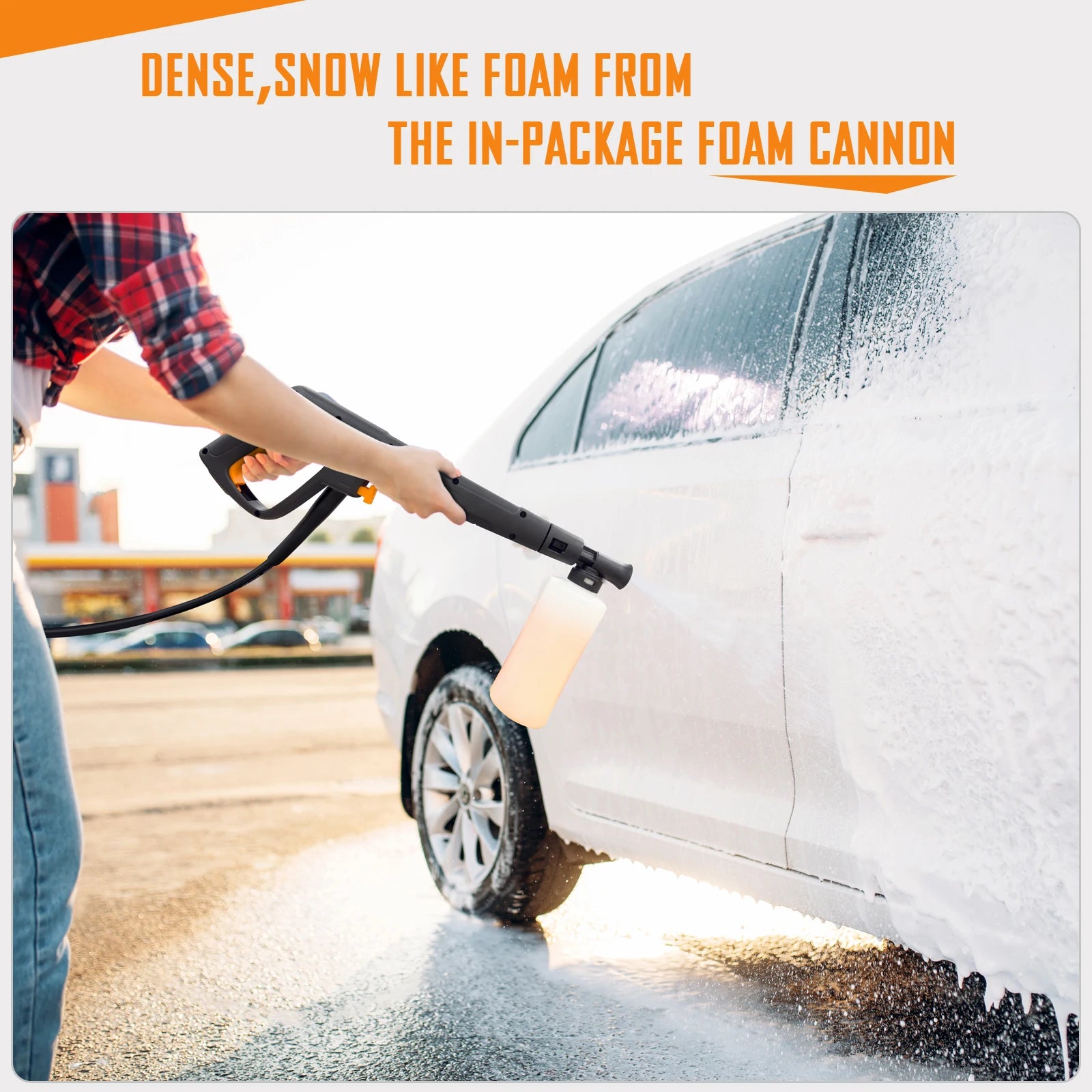 【Easy To Move & Store】: Our power washer is designed with a wheeled upright trolley, making it easy and safe to move around. The mesh stock on both sides can hold the spray gun, providing convenient storage. Additionally, the cable hook keeps the electric cable tidy, ensuring a neat and organized setup. Enjoy hassle-free transportation and storage with our power washer's ergonomic design.