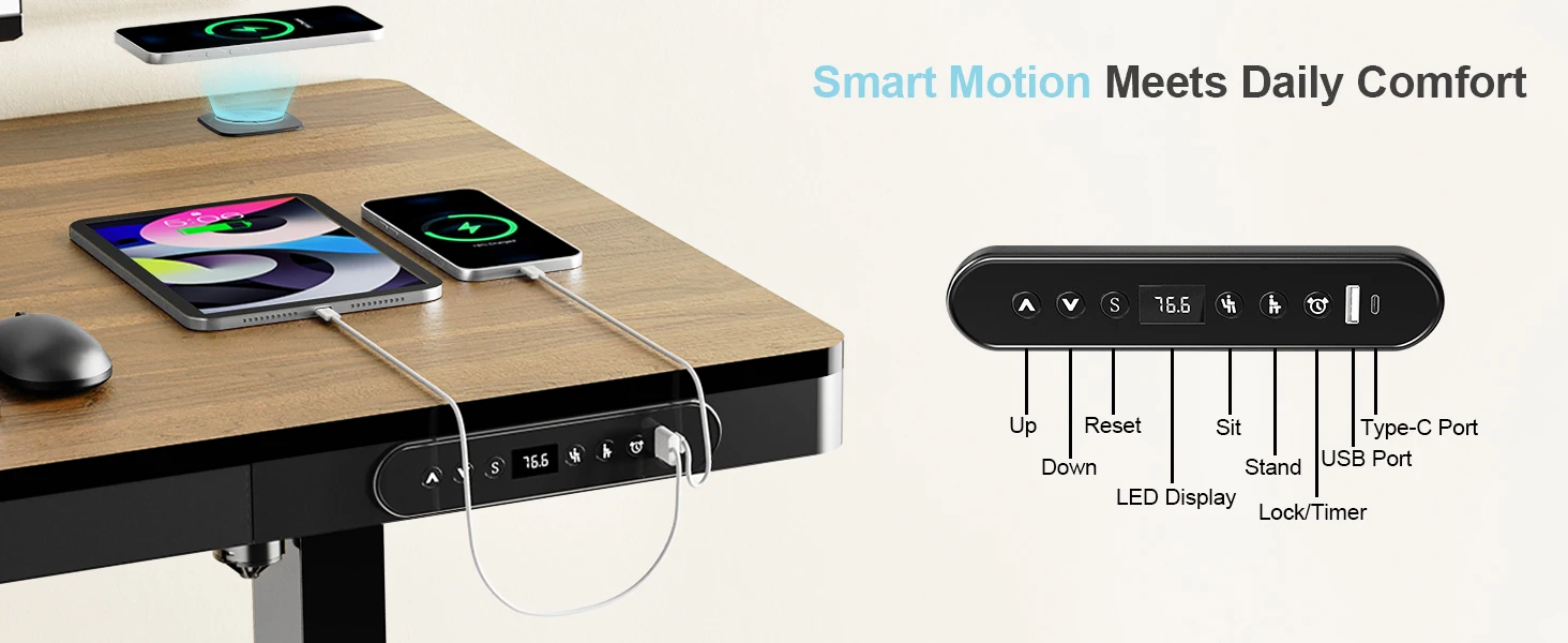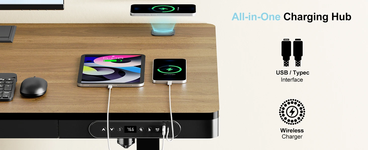 * INTEGRATED CHARGING STATION – Power your devices with built-in wireless charging, USB-A, and USB-C ports. Whether you're charging your phone, earbuds, or tablet, this standing desk keeps your workspace cable-free and fully powered