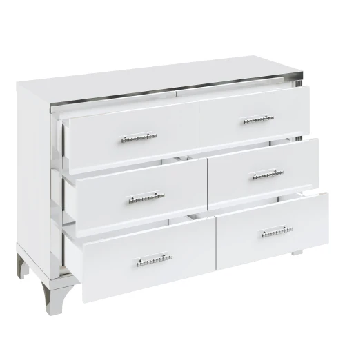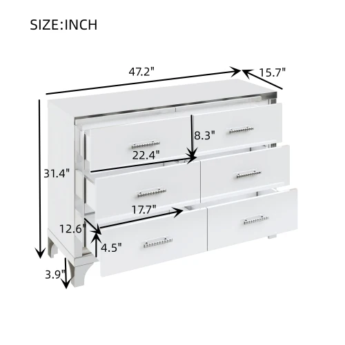 Elegant High Gloss Dresser with Metal Handle,Mirrored Storage Cabinet with 6 Drawers for BedroomOrganize your nighttime essentials with this dresser, featuring 6 drawers for clutter-free storage to save your space.The high gloss design of surface create a unique sense of space.It offers an excellent arrangement for your room to keep all things and free of clutter. The clean-lined design is built to last and given a relaxed, weathered finish.Modern style and versatility for many occasions, from large bedrooms to small apartments. Key Features * Sturdy Construction: This dresser is constructed of MDF and metal.In order to create a safe environment for your family, this cabinet is designed with anti-tip devices. It can be used for a long time.