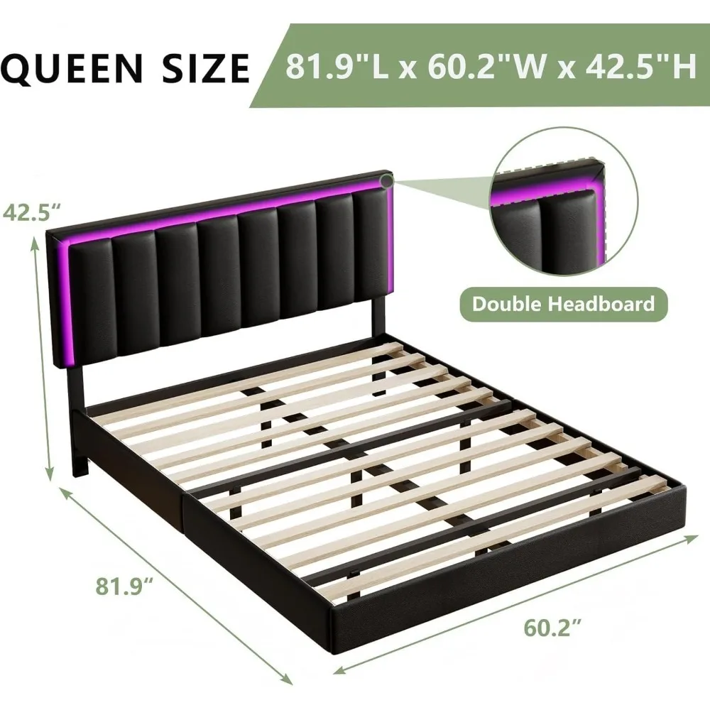 Built-in LED Double Headboard: Queen floating bed frame is embedded with RGB LED lights, providing more than 60,000 colors, while meeting the lighting needs, it can also create a romantic atmosphere in the room