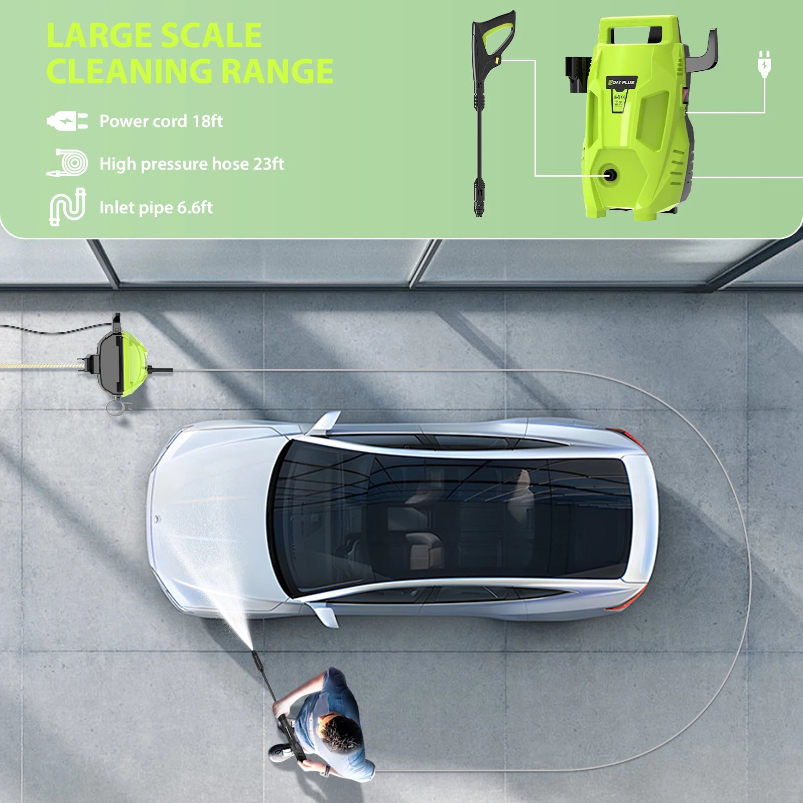 【Wide range】5.5-meter power cord+7-meter water outlet pipe, with a wide cleaning range.