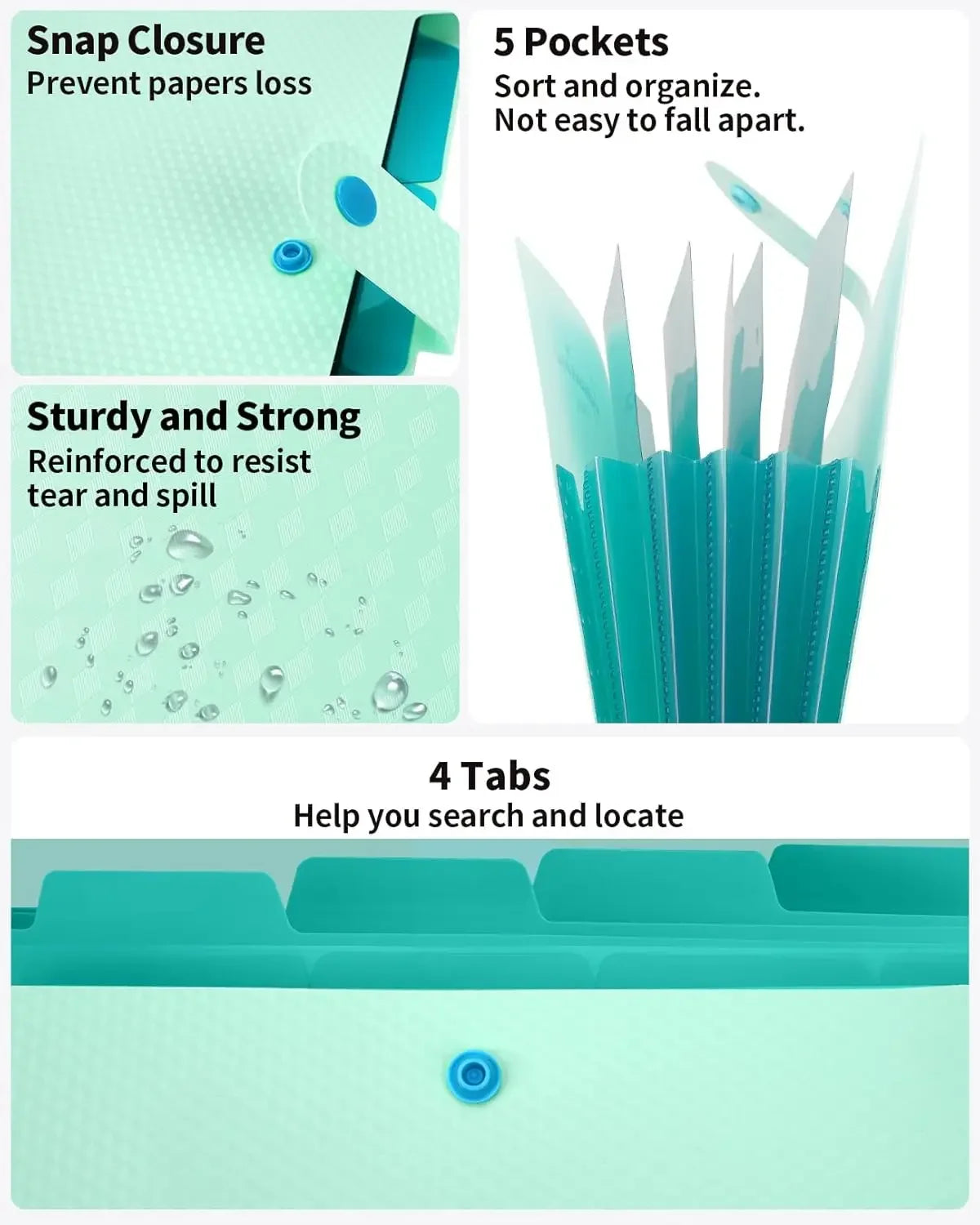 Easy Organization: This expanding file folder makes sorting and organizing your papers a breeze. Featuring 5 pockets with tabs and colorful labels for quick sorting and retrieval.