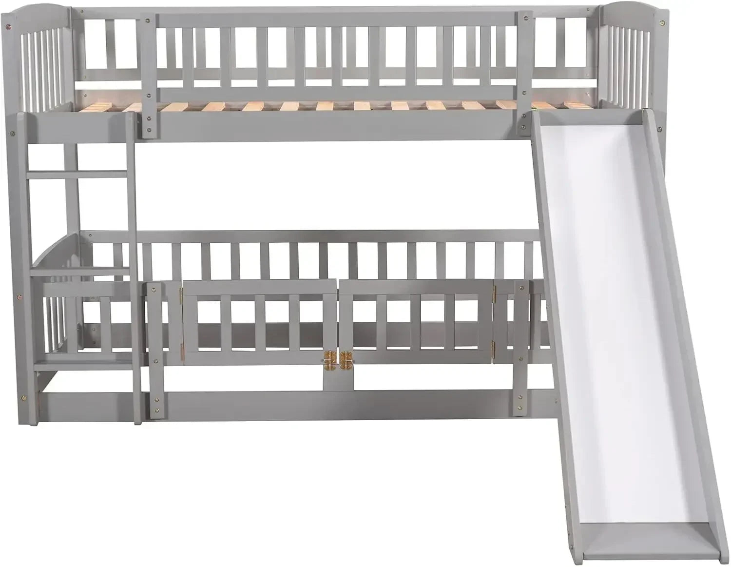 Low Bunk Bed with Slide Twin Over Twin Bunk Beds for Kids Toddlers, Wood Floor Beds Frame with Rails for Boys Girls Teens, Gray