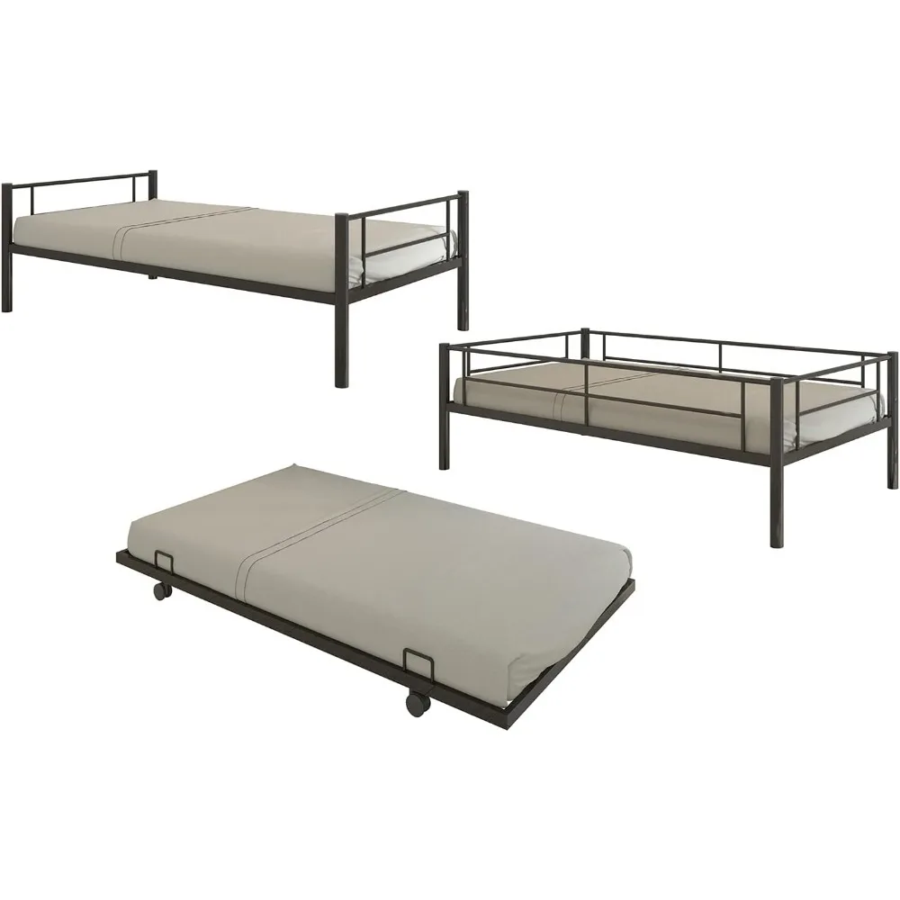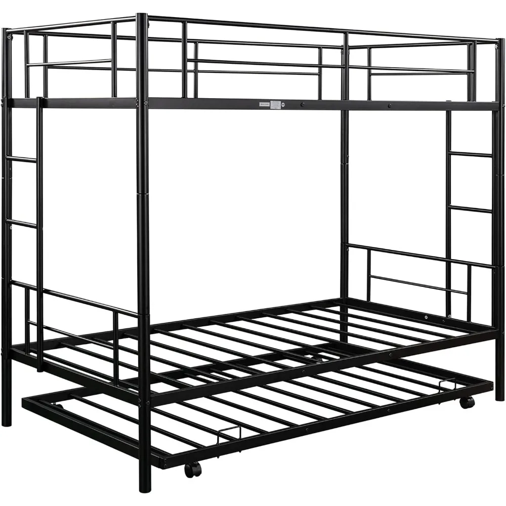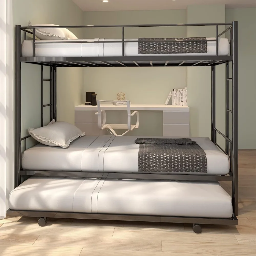 - Flexible Metal Triple Bunk Bed :The bunk bed can be divided into 3 independent beds when needed. You can easily pull the trundle out as a guest bed and put it back under the bed when you want to save more space.A very functional metal bed frame.