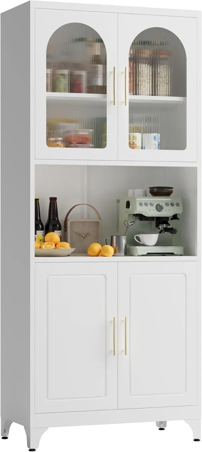 - 【Large Size】White metal pantry cabinet Size: 75"H x 32"W x 16"D. This kitchen hutch cabinets comes with two closed cabinets and an open countertop. Each cabinet has an adjustable shelf that allows the height to be adjusted freely. The pantry customizes the perfect food storage solution for your dining area
