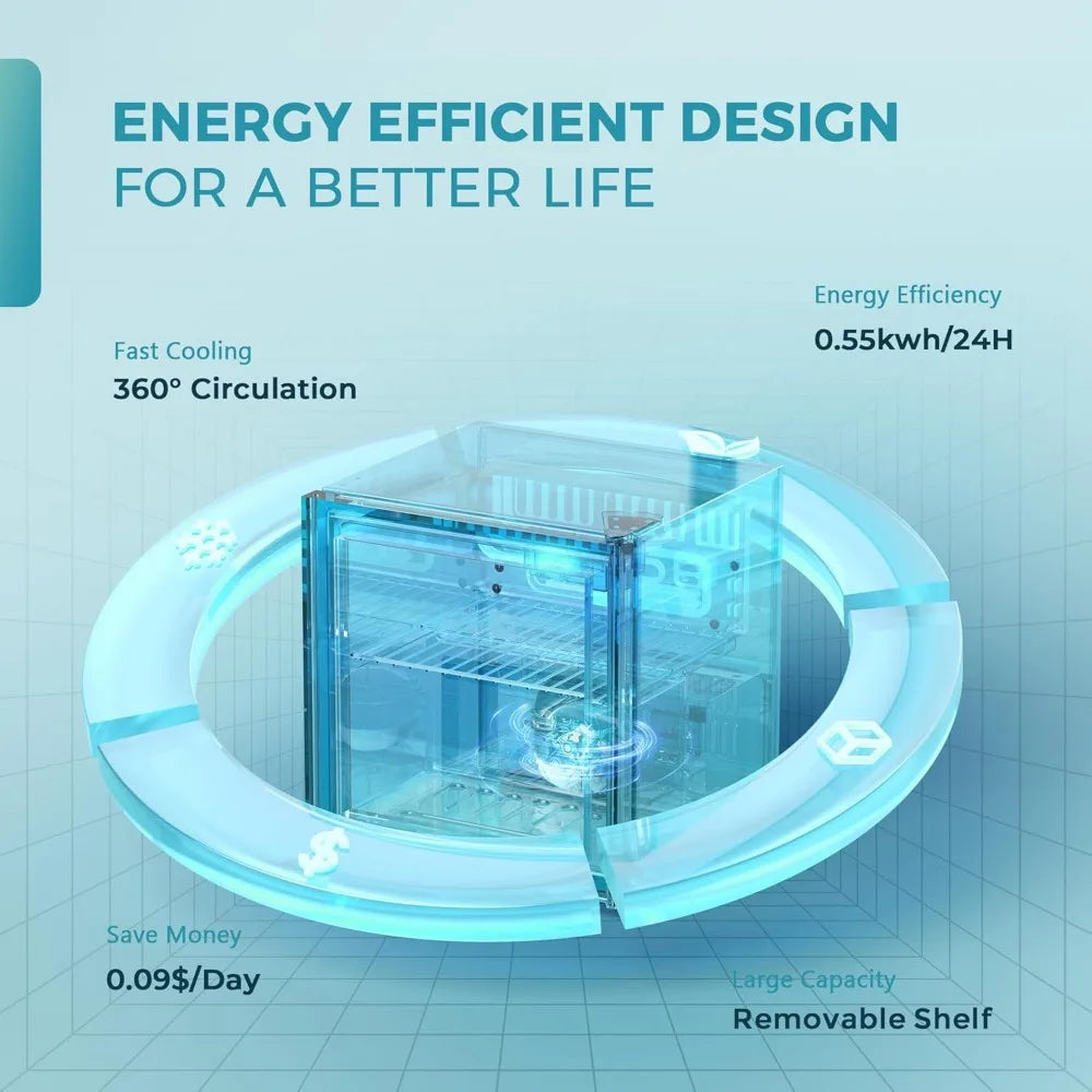 - ENERGY SAVING & QUIET - The mini refrigerator features a highly efficient and low-consumption compressor that uses only 0.55 kWh per day, ensuring optimal cooling with minimal energy consumption. The compact fridge operates smoothly and quietly, with a noise level of less than 38dB, making it suitable for use in any location