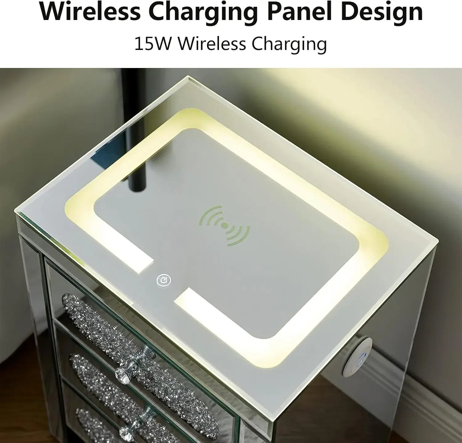 - Charging Function with Wireless Charging & 2 USB Ports -- Mirrored Nightstand features Wireless charging panel design and 2 USB ports make charging mobile devices conveniently (Wireless charging only supports the charging of mobile phones with built-in wireless charging function)
