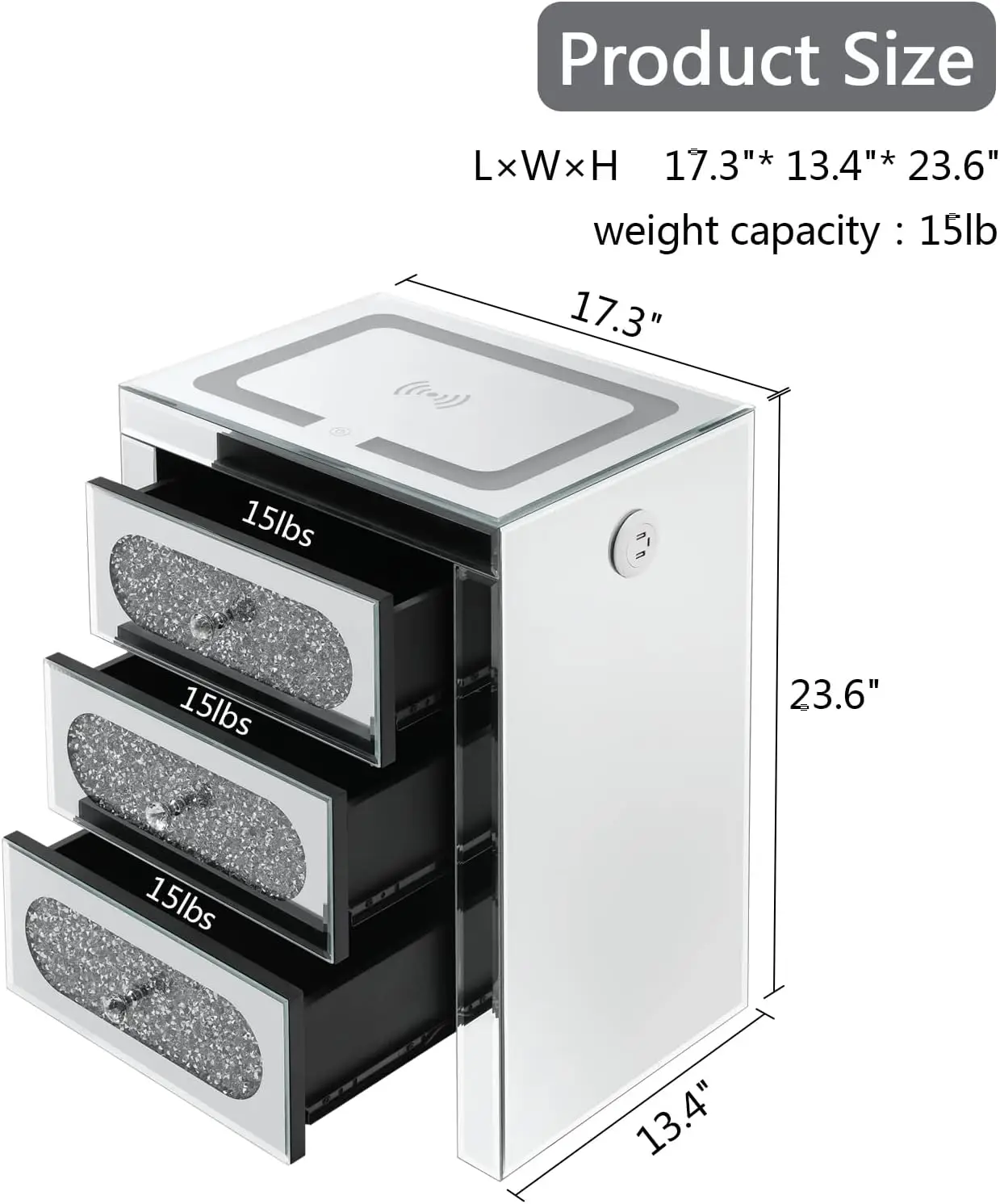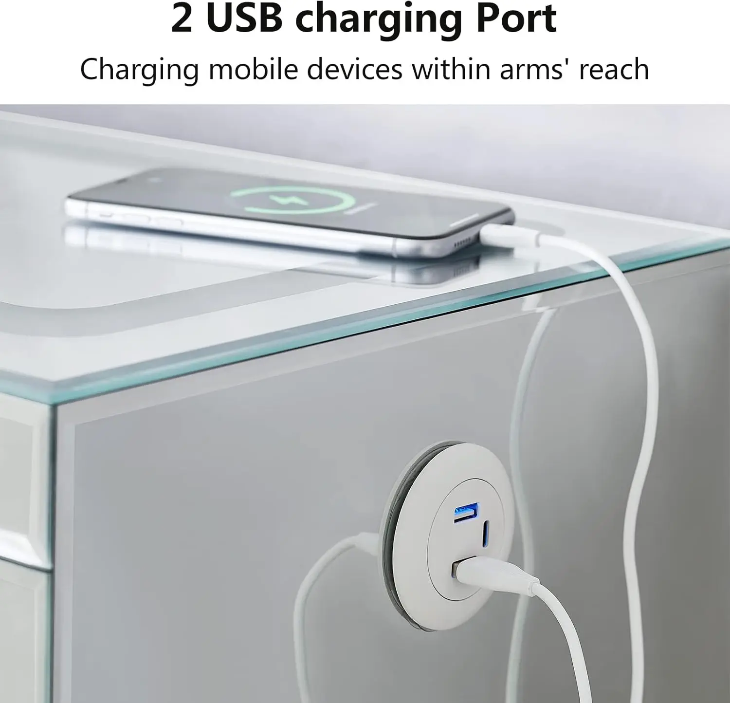 - Charging Function with Wireless Charging & 2 USB Ports -- Mirrored Nightstand features Wireless charging panel design and 2 USB ports make charging mobile devices conveniently (Wireless charging only supports the charging of mobile phones with built-in wireless charging function)