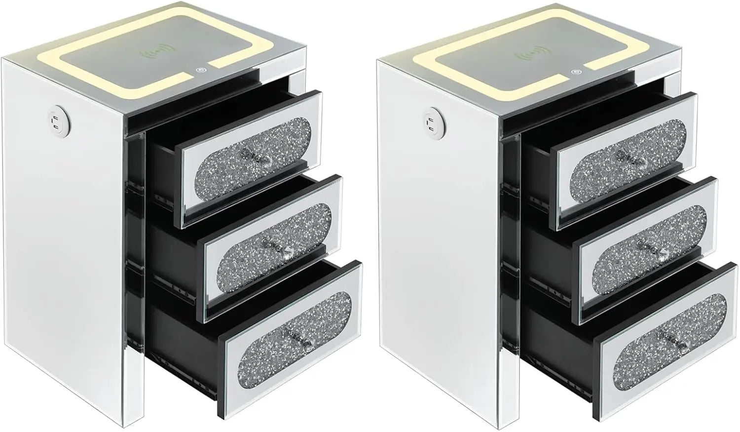Mirrored Nightstands Set with Wireless Charging Station and LED Lights