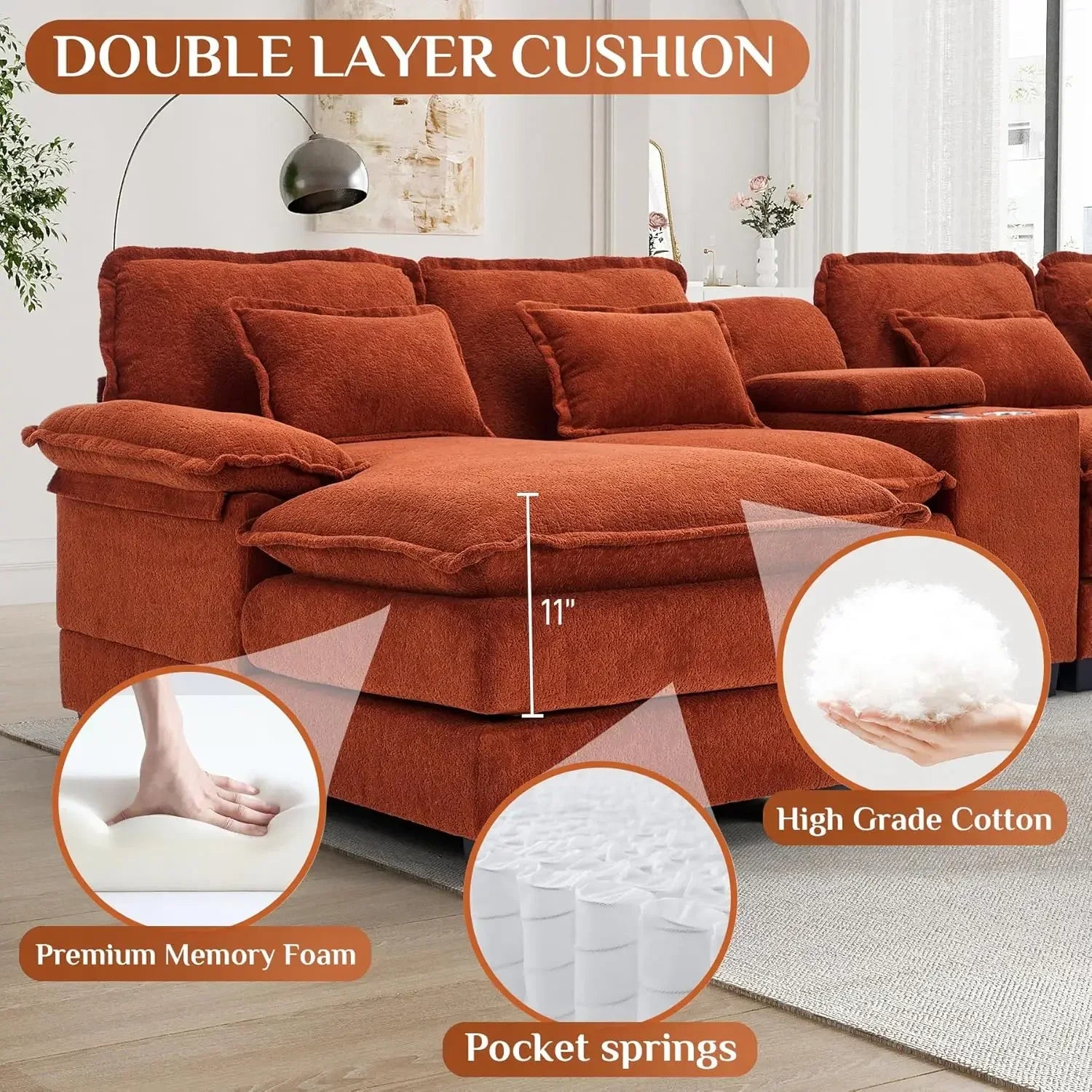 - Comfy Cloud Couch: This cloud sectional couch features upholstered 11" upholstered 2-layer seat cushions with memory foam and pocket springs, fluffy backrests and lumbar pillows that cradle you in comfort, providing a soft and cozy feel akin to lounging on a cloud