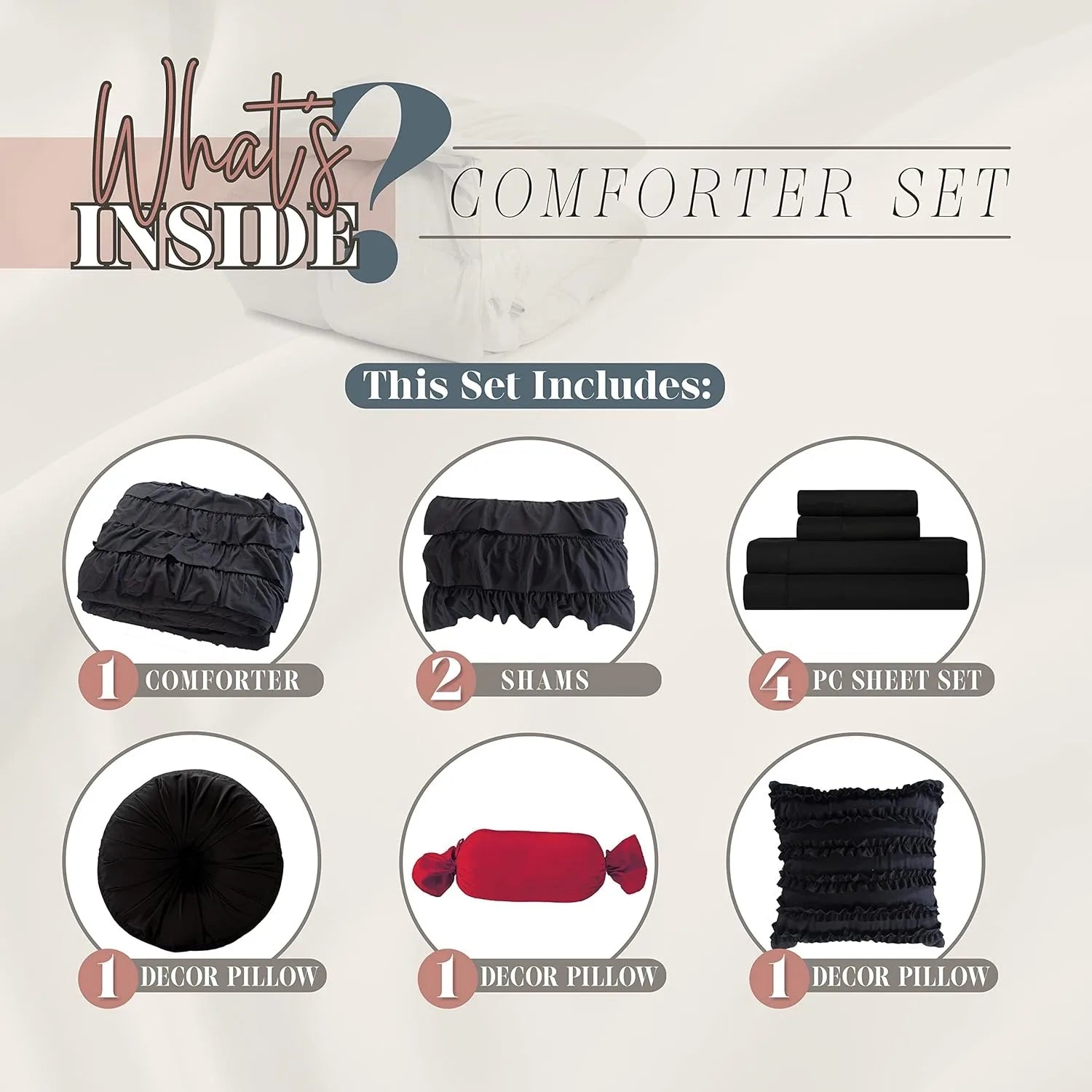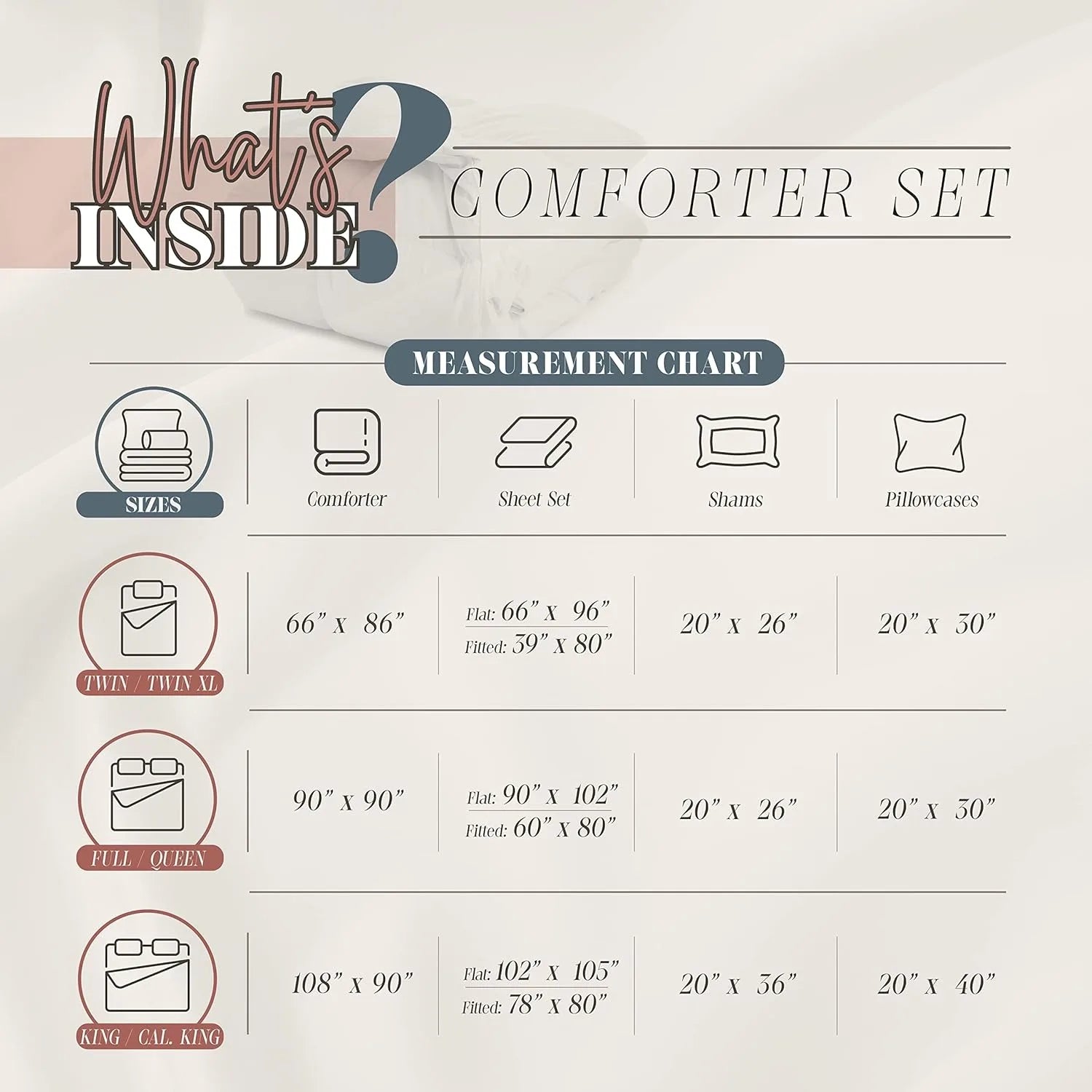 Included Components: (1) Comforter, (1) Flat Sheet, (3) Decorative Pillows, (1) Fitted Sheet
