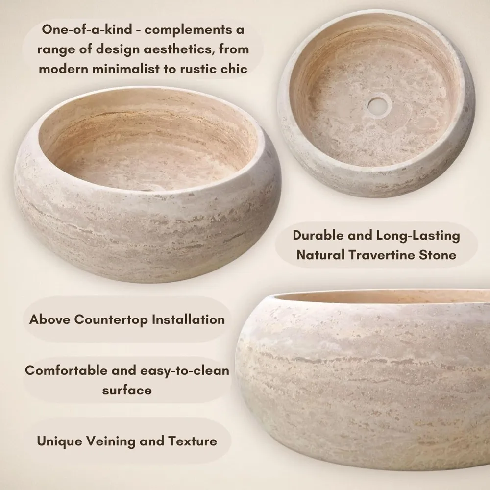 - Handcrafted Travertine Stone Sink: Expertly carved from genuine travertine, this round vessel sink features natural texture and veining for a one-of-a-kind look. Its warm stone tone brings elegance and organic charm to any bathroom or powder room.