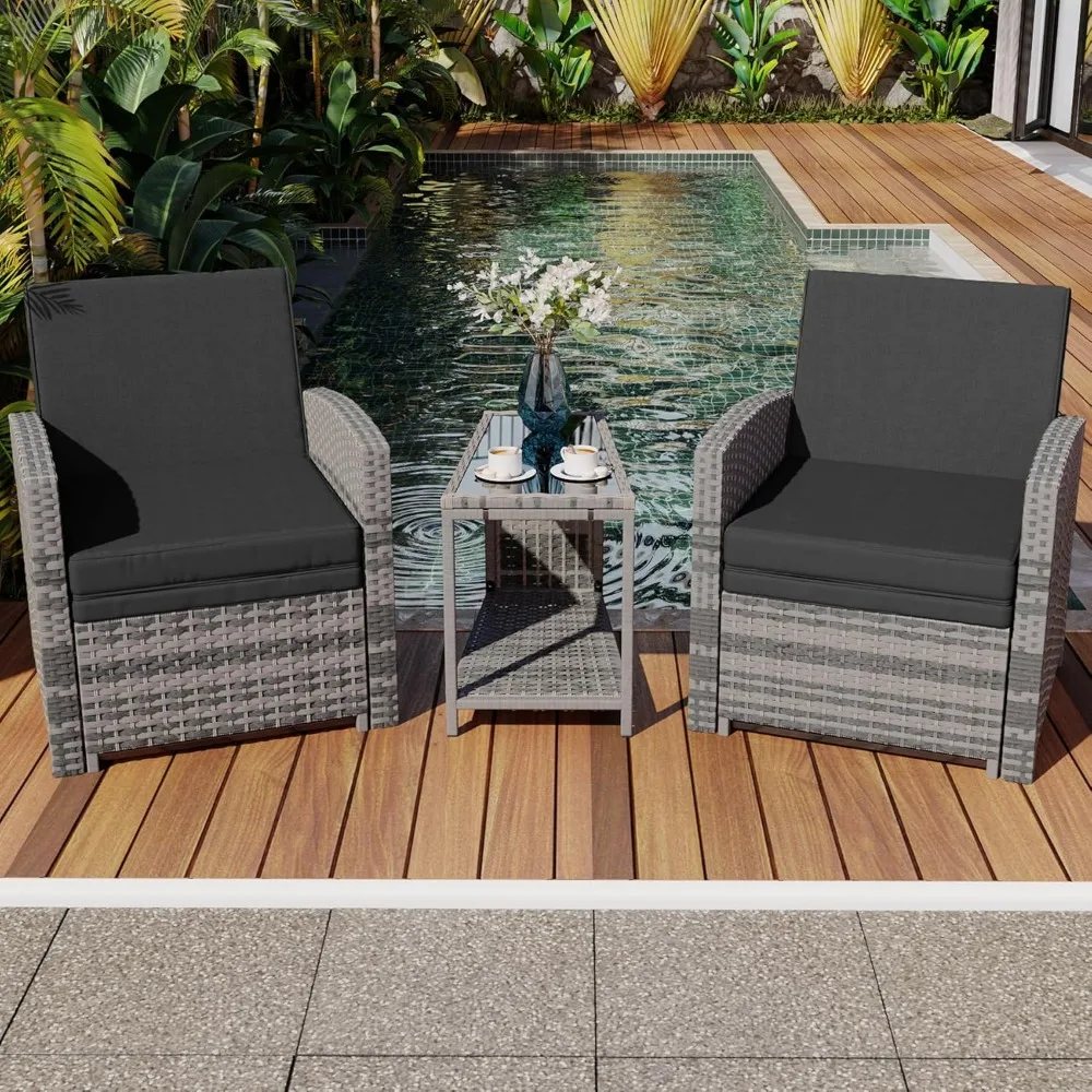 - 【Built-in Tempered Glass】The patio chair set also includes a tempered glass coffee table, which adds a touch of sophistication to your outdoor space. The tempered glass top provides a safe surface for placing drinks, food, or other decorative items. Its sturdy construction ensures stability and reliability, and it stays securely in place during use.