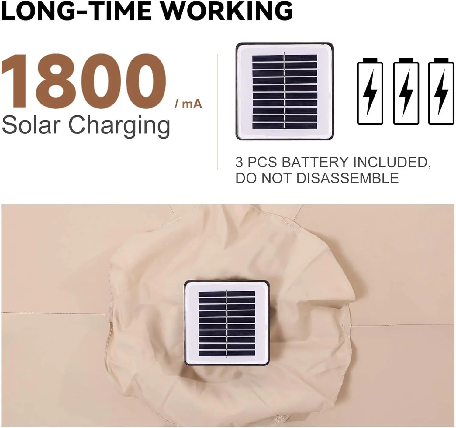 SOLAR POWERED: 10ft solar outdoor umbrella with a special centre wrap around light and 24 LED beads, 1800mA rechargeable NiMH battery operates for 6-7 hours on a full charge, umbrella diameter: 114inch. Light up the night, gather under the lights and add a warm atmosphere