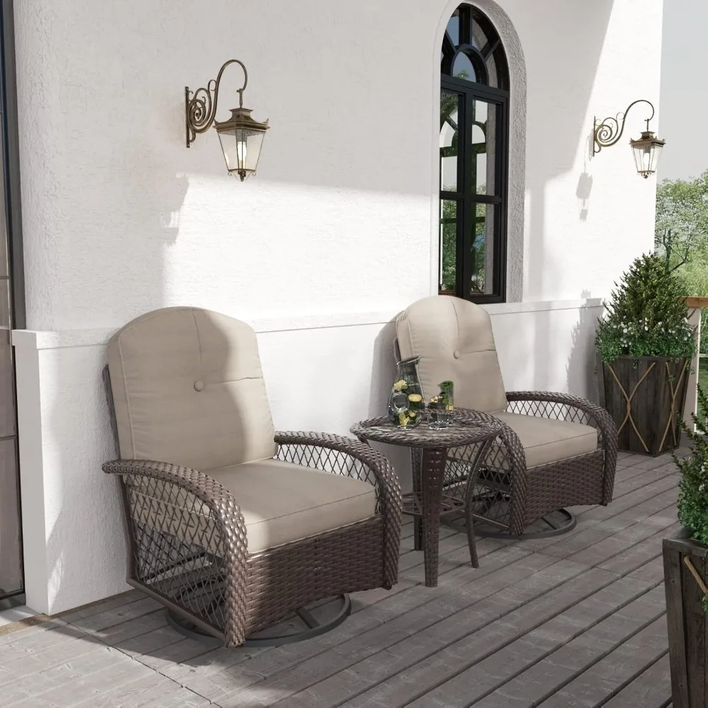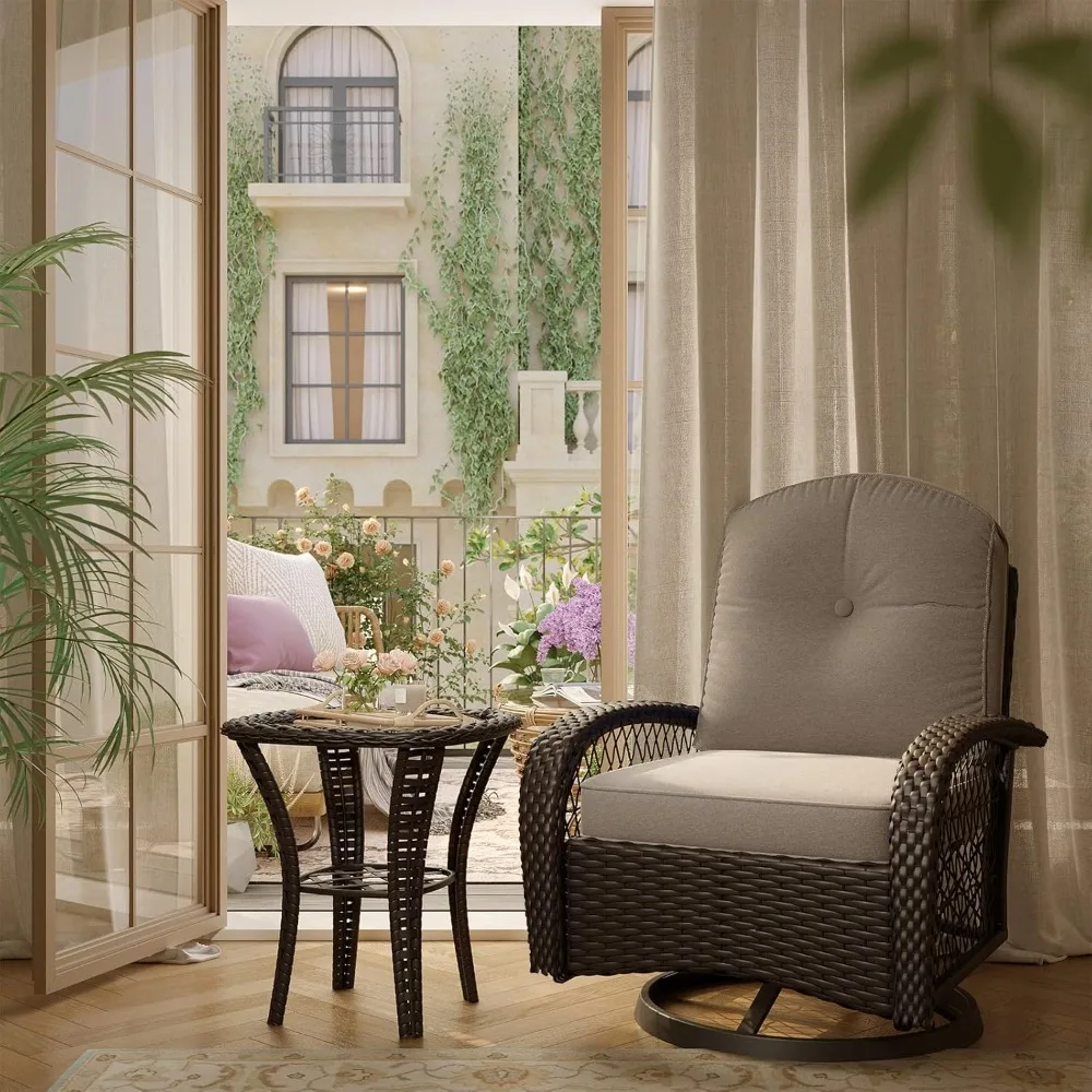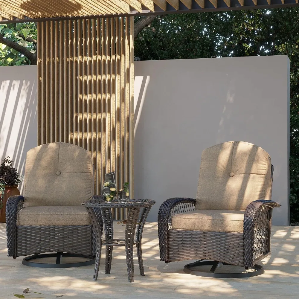 - High Quality Patio Chair Set - The patio furniture set comes with 2 sturdy swivel chairs and 1 sturdy glass table. This 2 rocking chairs has sturdy and rust proof metal frame. Also the tempered glass coffee table is easy to maintain too.