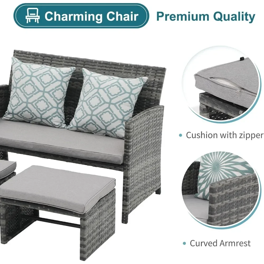 Premium Material - This outdoor wicker loveseat set is made of powder coated steel frame and hand-woven PE rattan which is durable enough to withstand all weather variations. The couch overall is durable and lightweight. Great for outdoor use. The steel frame is rustproof and can provide a long-time service for you. Additional Cushion Cover - Comes with 2 pillows and seat cushions that are double comfy. Removable zipper for easy cleaning. With replacement taupe seat cover. The cushions are sheathed in white zippered cover when you receive them. Please take off the blue cushion cover first when you replace the taupe covers. Multifunctional Ottoman - Added Button on the ottoman to keep your cushion on, The patio wicker ottomans can be used as side tables, footrests, or extra seating. They can also be stored under the patio armchairs for space saving. Attractive Design - Creates a modern look that works well in a variety of garden settings. Ergonomically designed for more comfort of the rattan chair set for the balcony. Perfect for relaxing or entertaining, this contemporary small porch furniture is a patio essential. Quick Assembly - Set included 1 x loveseat, 2 x ottomans, 3 seat cushions, 2 pillows, and 3 taupe covers. All necessary hardware and instructions are included. This patio bench set is perfect for small space, please check the size before placing an order.