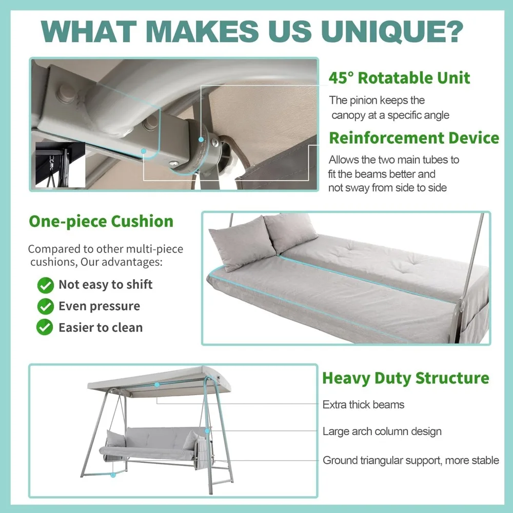 - Silent Swing Zone - Upgraded noise-free bearings let you sway peacefully during rest, nap or midnight stargazing—no creaks, just serenity! Beam reinforcement design and the rotatable pinion keeps the canopy firmly at a specific angle, no more worrying that it will not be level.