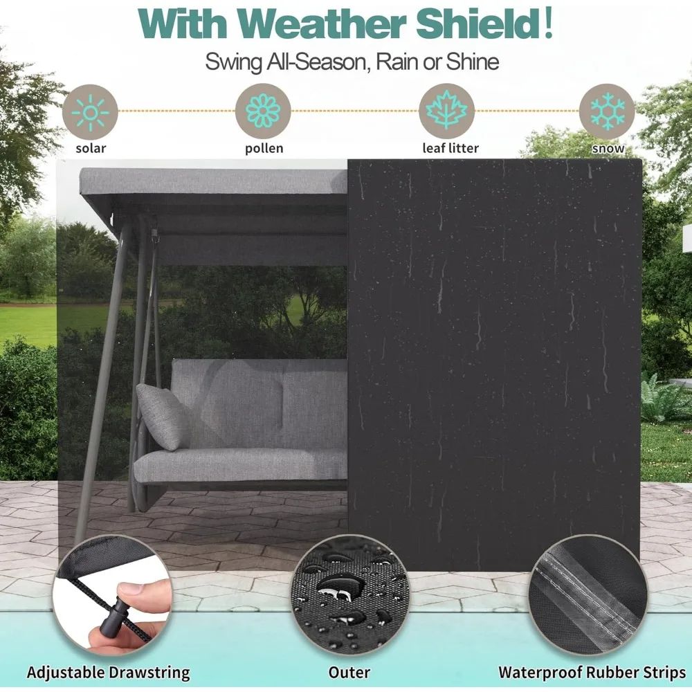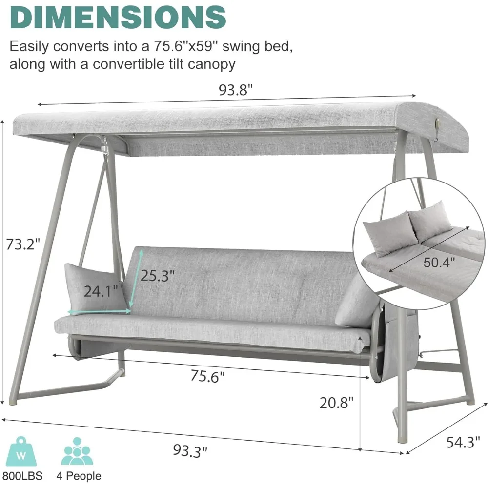 - Oversize Swings - Seater Dimensions: 74.7"(H) X 98.8"(W) X 54.3"(D). Large Weight Capacity: 800lbs (fits up to 4 people). Make a cozy, private shaded lounge anywhere in your poolside, backyard, patio, or porch. An adjustable backrest and a convertible tilt canopy are features of this front porch swings.