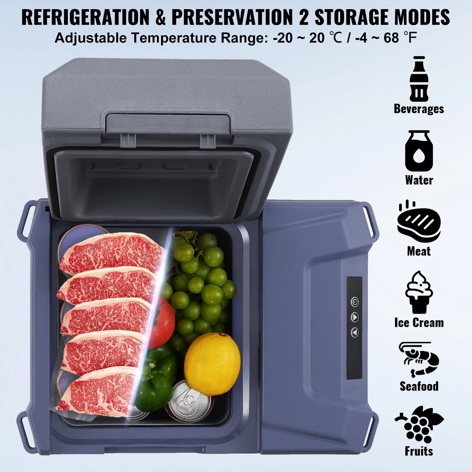 Large Capacity: The portable refrigerator freezer has a single compartment capacity of 8 L-75L. This robust RV fridge can hold 16 cans of 330ml cola or 15 bottles of 550ml water, accommodating seafood, snacks, meats, and beverages, meeting the needs of short trips such as travel, boating, and camping.