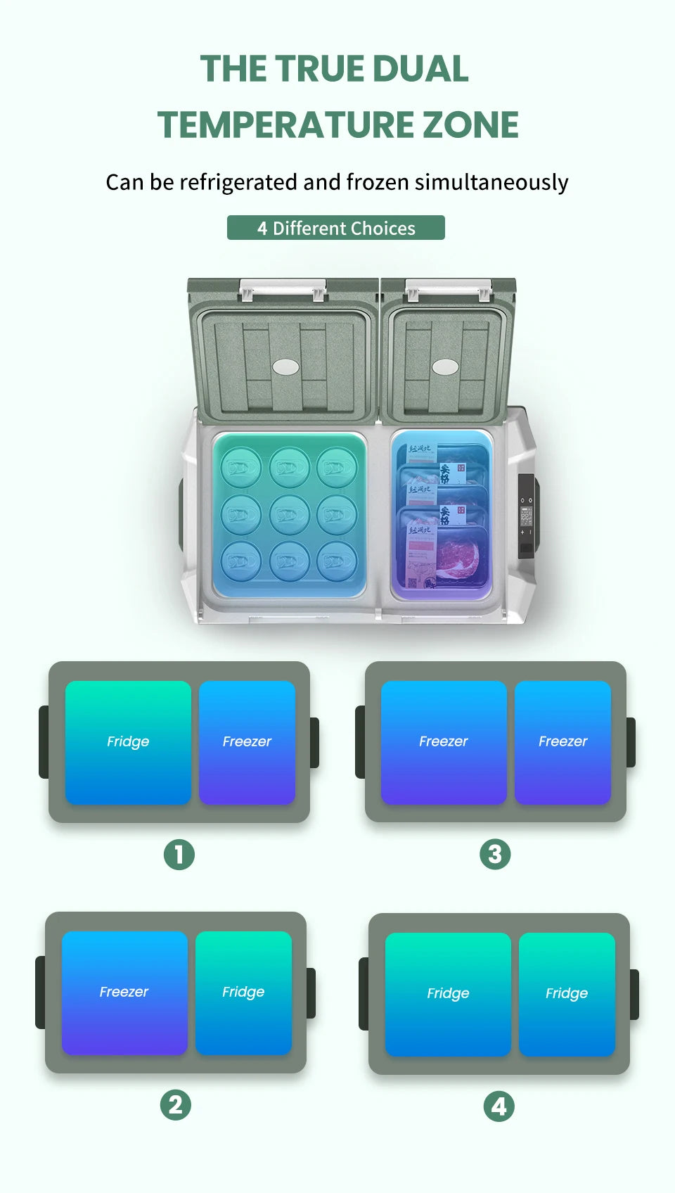Alpicool portable fridge adopts the latest design of dual zones with dual control technology, you can control the temperature of two zones independently, ranging from -20℃ to 20℃. Whether using one side as a refrigerator and the other as a freezer, or both sides for the same purpose, it caters to diverse needs.