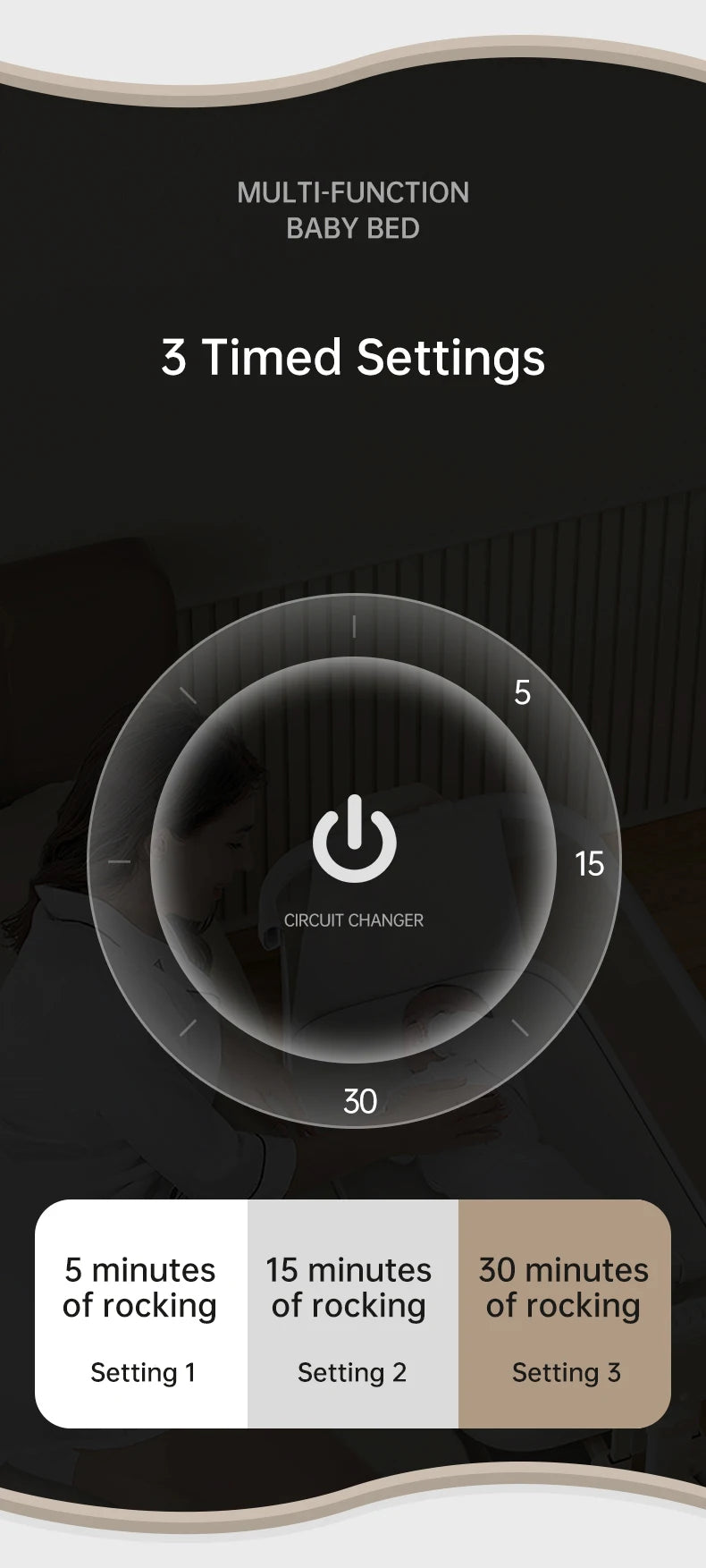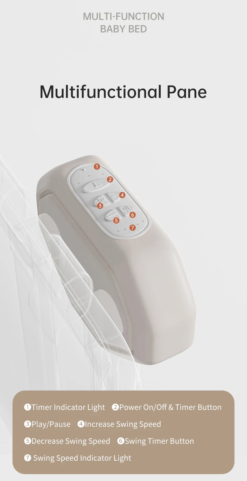 Five Adjustable Settings for Electric Gentle Rocking; The duo controls on cribs are remote control and panel control. There is 5 different gentle rocking of the crib. And there is 3 gear timing(5 mins, 15 mins, and 30 mins), auto-stop while timing ends. It's also Lock When Not Swinging