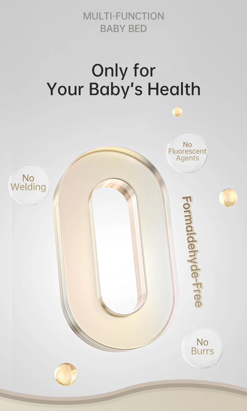 Frame Humanized Design; Made of skin-friendly linen cotton fabric, lightweight aluminum alloy, and carbon steel frame. (it's No welding, No fluorescent Agents, No formaldehyde, No burrs)The fabrics of baby cribs are removable to clean. One side of the crib is opening for leaning against with parents' bed. The height of the crib is adjustable. And there is a large storage basket below