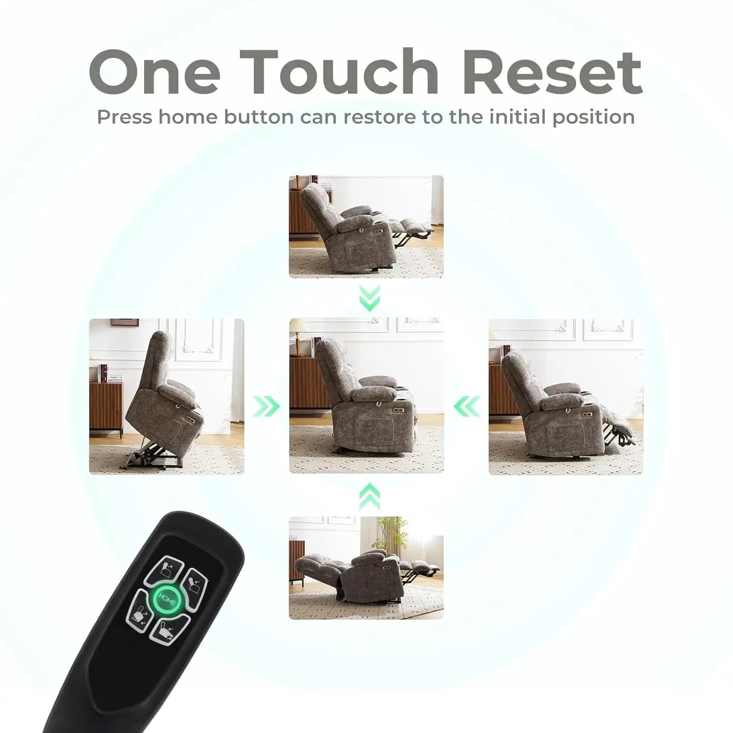 One-Touch Reset & Power Lift Assistance: Experience the convenience of the Home Button one-touch reset feature.This power lift recliner chair swiftly returns you from any recline position to a comfortable sitting posture. The dual motor counterbalanced lift mechanism ensures a gentle and safe lift to a standing position. The backrest and footrest of this extra wide recliner can be adjusted individually, facilitating easy standing for the elderly.